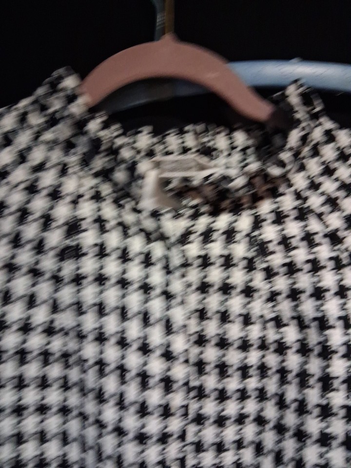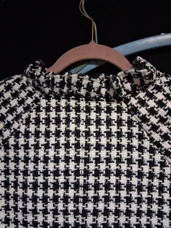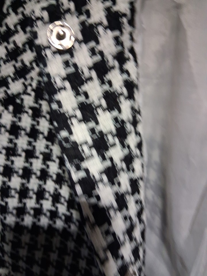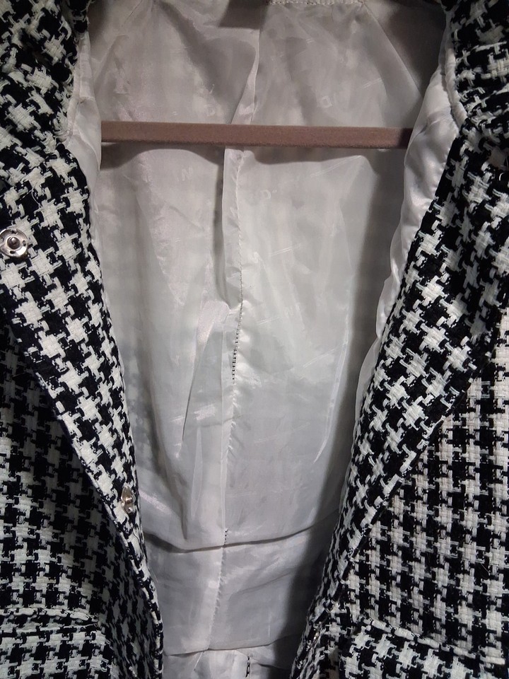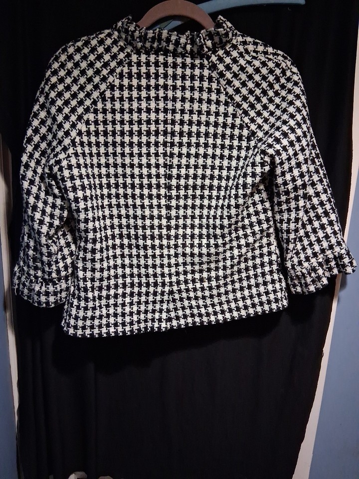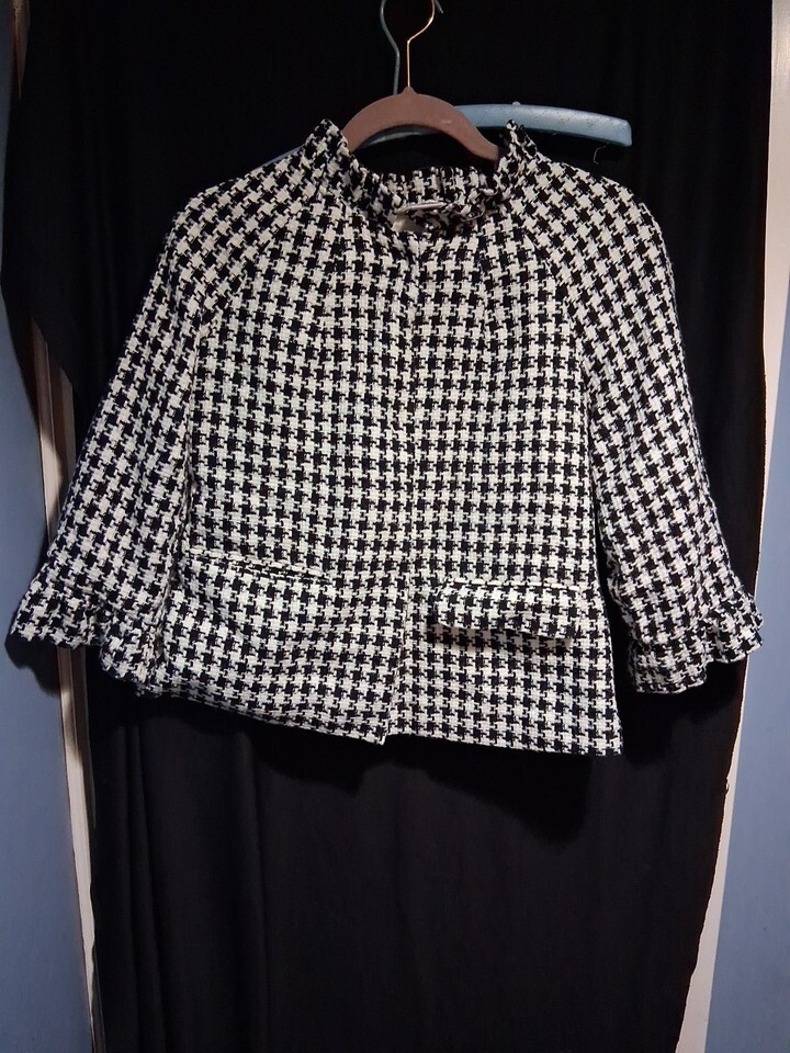 The WD.NY Women's Jacket in black and white with a houndstooth pattern and 3/4 sleeves is a stylish and versatile addition to any woman's wardrobe. This lined jacket features a woven poly fabric with a ruffle accent, making it perfect for various occasions. The size 8 jacket is designed for plus-size women, offering a flattering fit with a touch of sophistication. Perfect for those looking to add a statement piece to their collection with a classic and chic style.