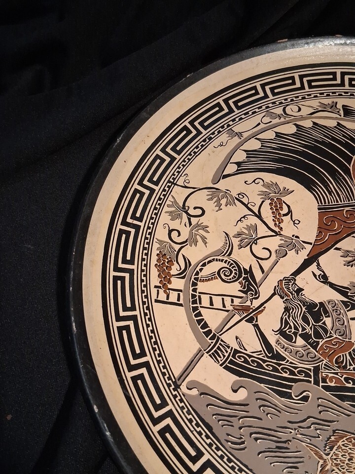 This large terracotta clay plate features a vintage design inspired by Dionysos and the Odessey. Crafted from high-quality clay, this collector plate adds a touch of authenticity and charm to any decor. Perfect for history buffs, art enthusiasts, or collectors looking to add a unique piece to their showcase. Ideal for displaying in a home, office, or as a standout piece in a collection.
