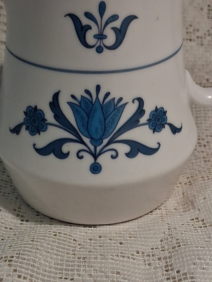 The Noritake Blue Haven Creamer Progression is a vintage stoneware creamer made in Japan. With its original design and beautiful blue color, it is a high-quality piece for serving cream at the table. The Noritake brand is known for its craftsmanship and attention to detail, making this creamer a valuable addition to any collection or table setting.