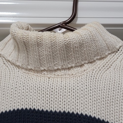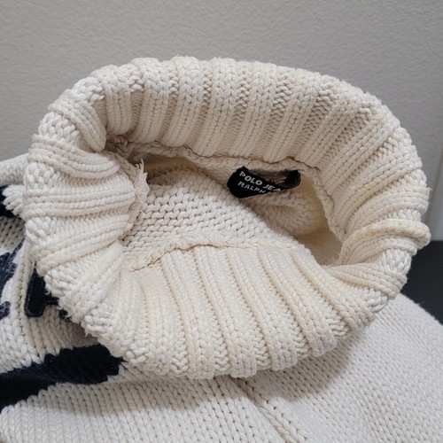 Rare Vintage Polo Jeans Co Ralph Lauren Heavyweight Cable Knit Spell-out Off-White / Cream with Blue Raised Letters Turtleneck Sweater. No Size Tag. Actual measurements: 43" chest, 26" + 5" (collar) = 31" full length. Adult's Size Large.
