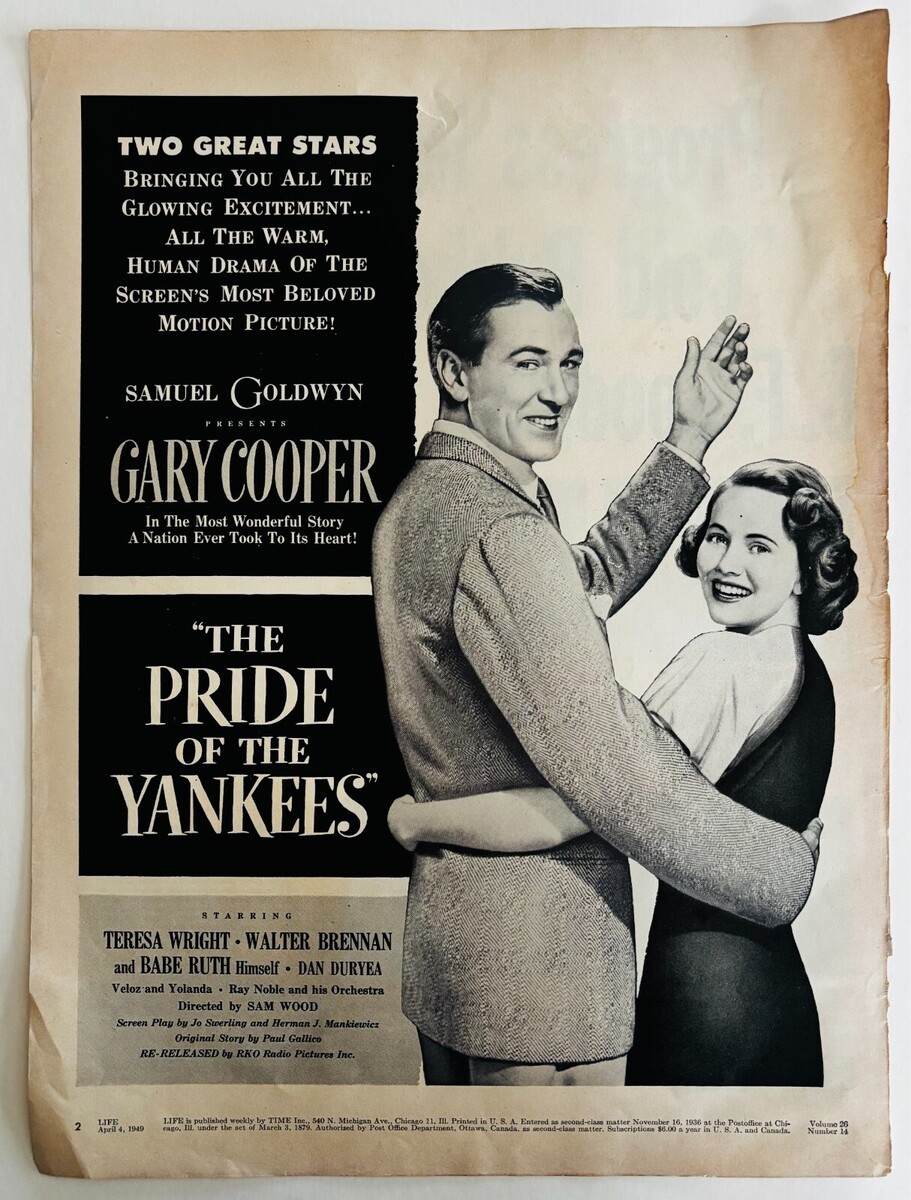 1949 The Pride Of The Yankees Movie Advertisement Gary Cooper Babe Ruth DWJJ17