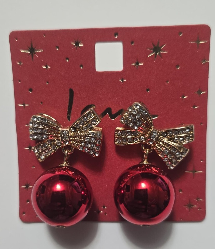 I Am' New Limited Edition Gold Christmas Bow & Ball Ornament Red Earring