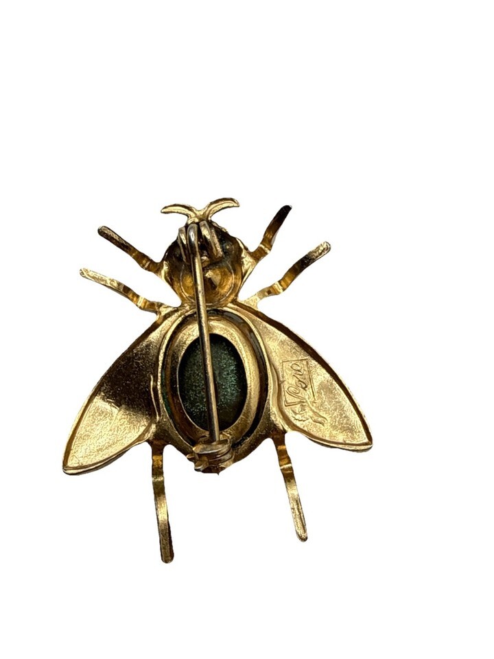 The product is a vintage 1950s signed CORO PEGASUS gold tone champagne rhinestone bug shape pin brooch. The brooch features a unique bug shape design with rhinestones in champagne color set in a gold tone base metal. This collectible piece measures about the size of a quarter and showcases the signature of the brand, making it a desirable item for vintage jewelry collectors.