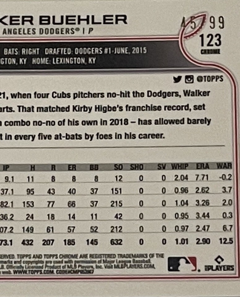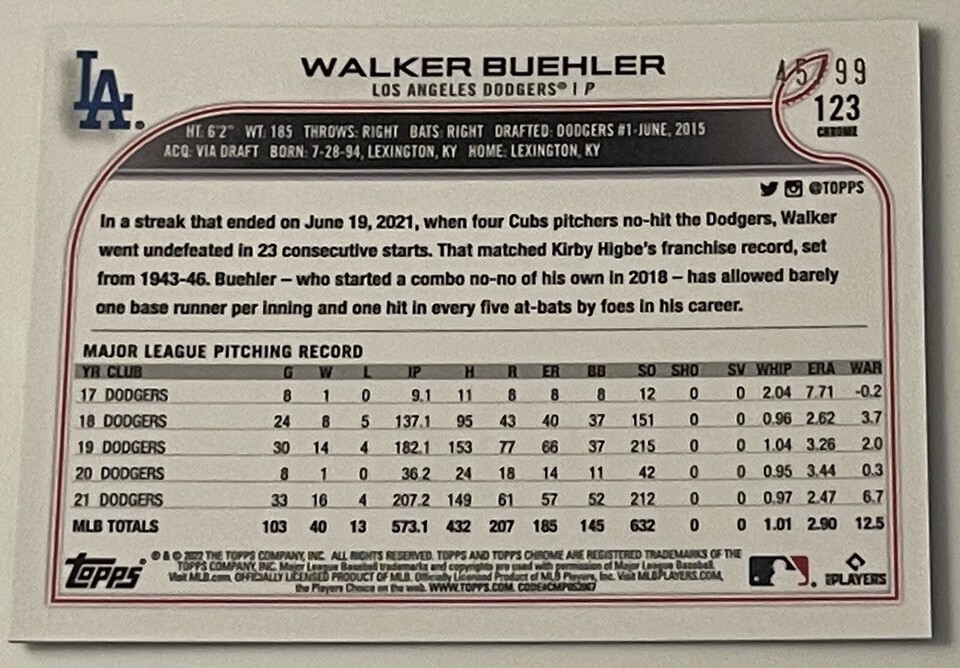 2022 Topps Chrome Walker Buehler Green Logofractor SP #45/99 LA Dodgers MINT!.