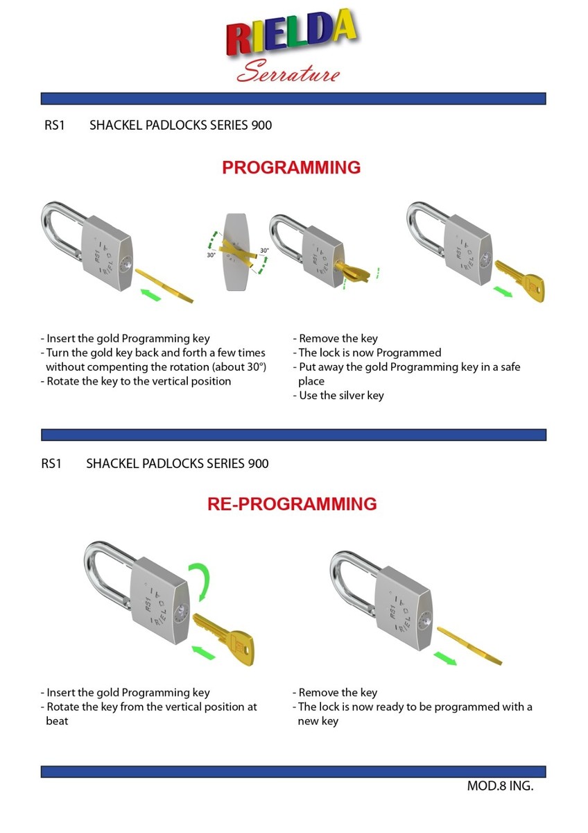 RIELDA offers a wide range of Re-programmable shackle Padlocks with several shackles length and body size. The padlock cases are constructed of quality brass with shackles of stainless steel for corrosion protection or hardened steel for protection against sawing and cutting and provide better tensile strength to resist pulling attack. All the shackle padlocks incorporate picklock functions and stainless steel inserts to provide resistance to corrosion and drilling attack. Rubber weather seals around the leg and chrome finishes make this padlocks suited to harsh weather conditions. Drainage holes prevent freezing. The shackle padlock can be keyed into a master key system. Special drainage channels allow water to flow through the padlock rather than getting trapped inside and freezing during the cools weather. All the Re-Programmable padlocks series can be keyed into RIELDA Re-Programmable Master Key Systems. All the Re-programmable Padlocks are designed with the patented "Double-Locking-System" which offer high resistance against pulling. Patented key control. Restricted, factory registered key system with exclusive key codes assignment available on request. Typical applications are gates, cash boxes, lockers, tool b oxes, box in car and lorry, truck rear door, and cabinets, motor cycle, storage rooms doors, grilles, shop Windows, trailers, railway wagons, power stations, fuel and hydraulic tank, switches cabinet. door in factory warehouse.