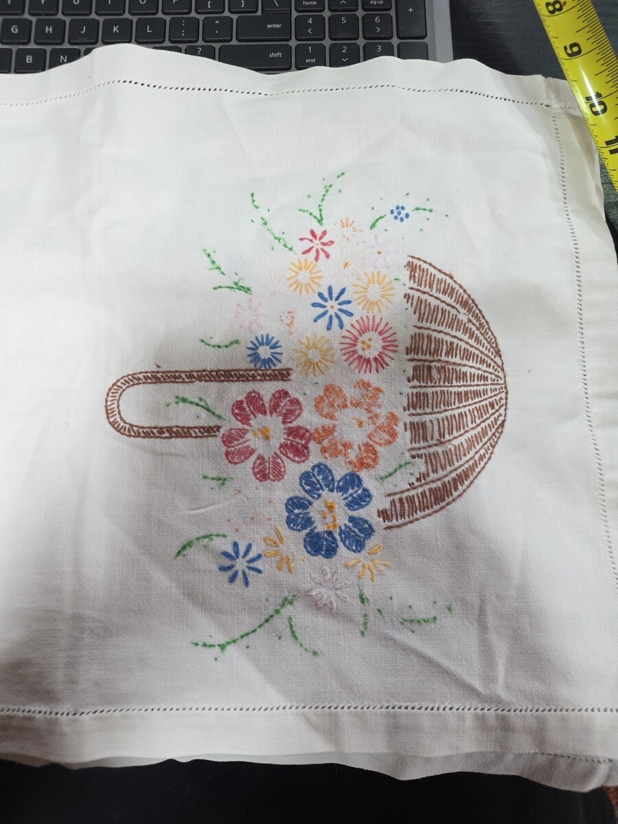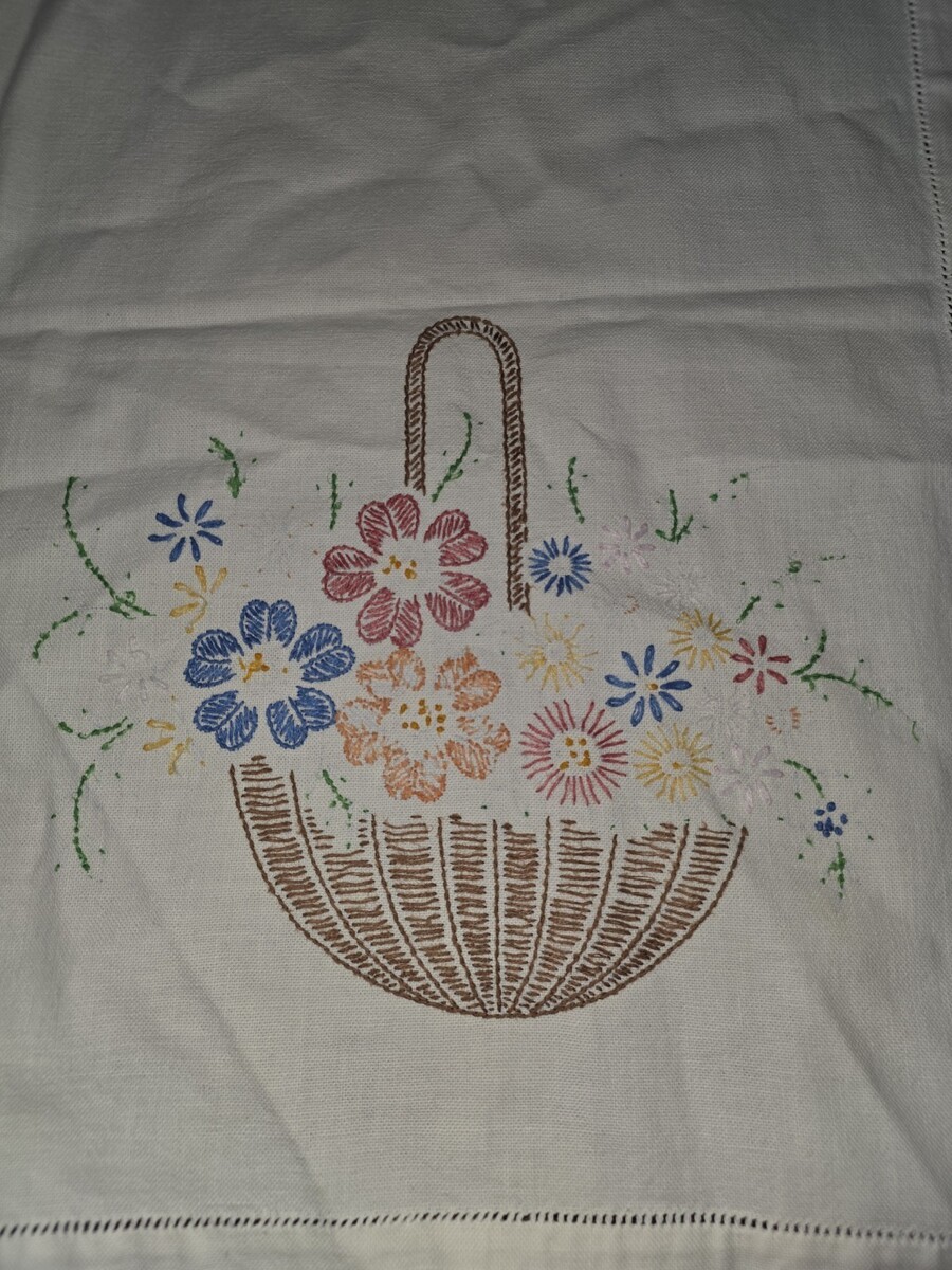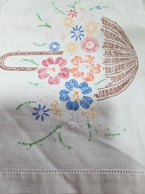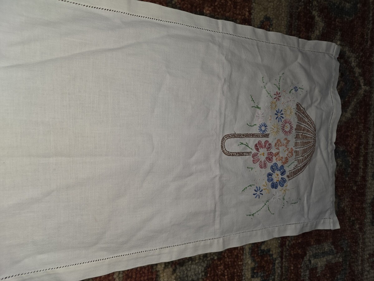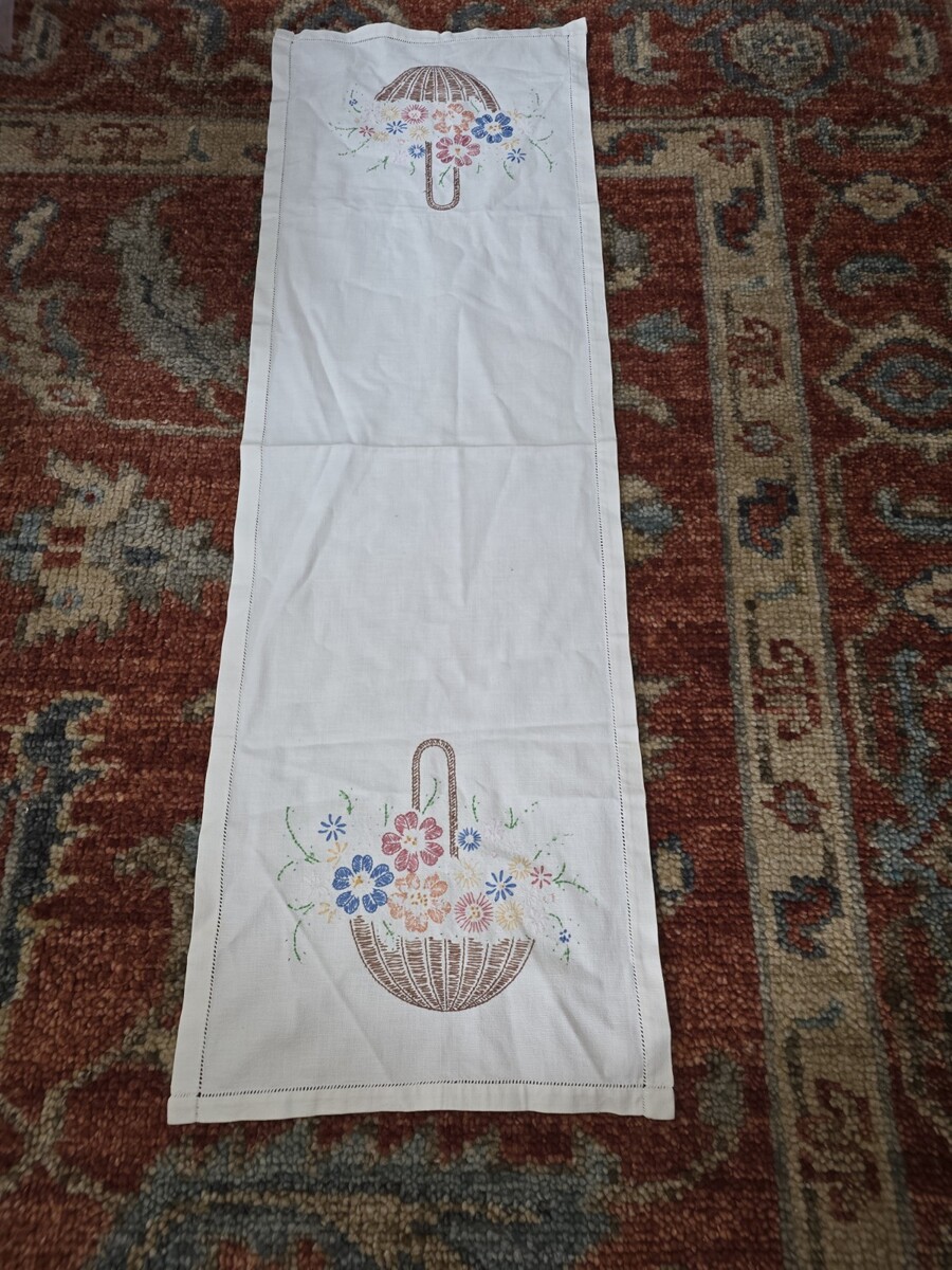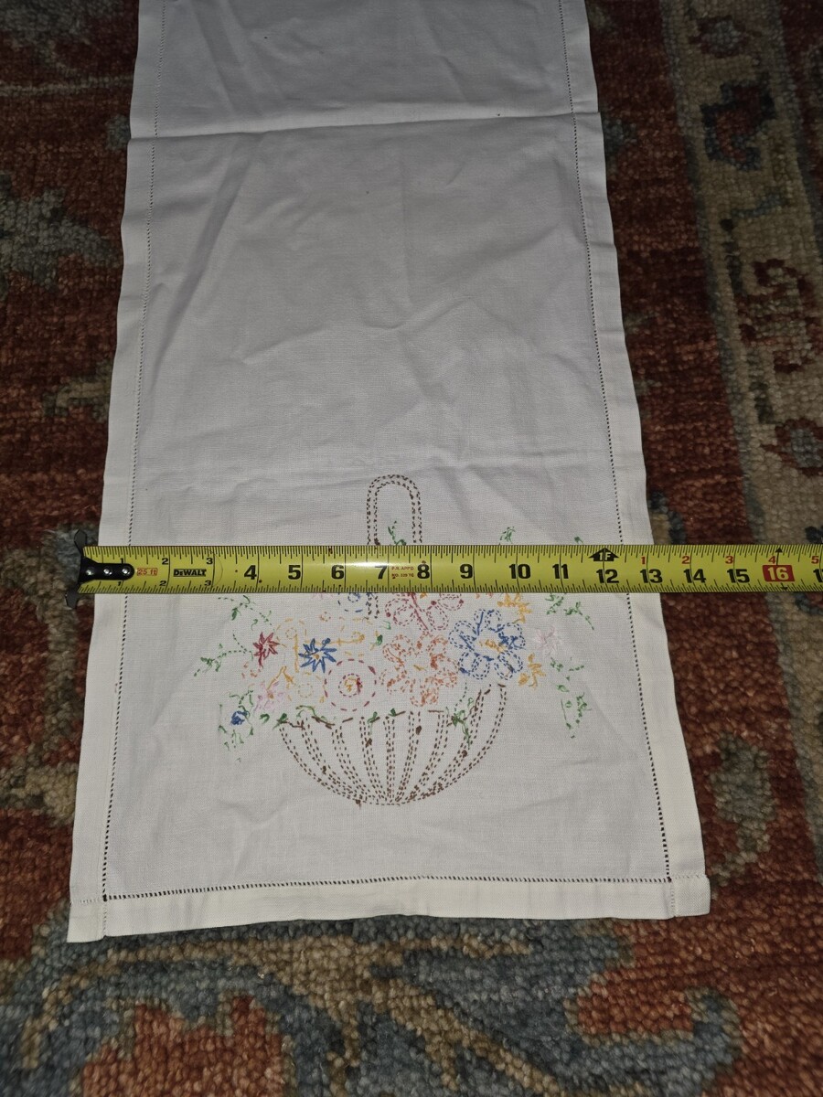 Vintage Embroidered Table Runner Flower Basket Floral Hemstitched Spring Easter