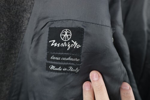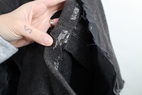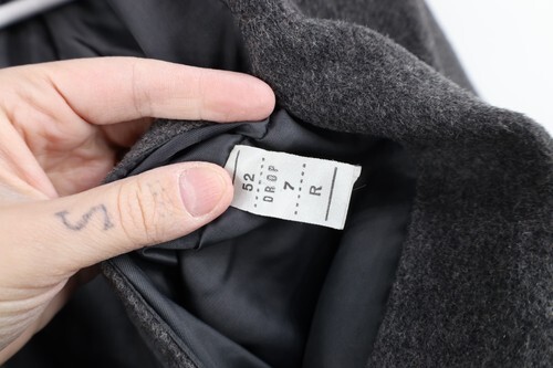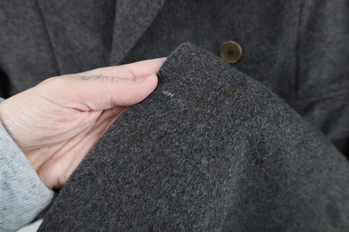 Holes/ripped inner bottom lining, and inner armpits, inner pockets. Sticker residue ripped along bottom hem. Stains, Blemishes front. Thread bare spot front bottom. Collar, cuffs, inner lining discolored. Color faded. Pilling. Has shoulder pads. Tagged EU 52 which is a US 42. 18.5 inches shoulder to shoulder seam. 25 inches shoulder seam to cuff