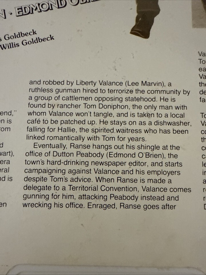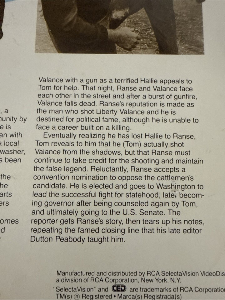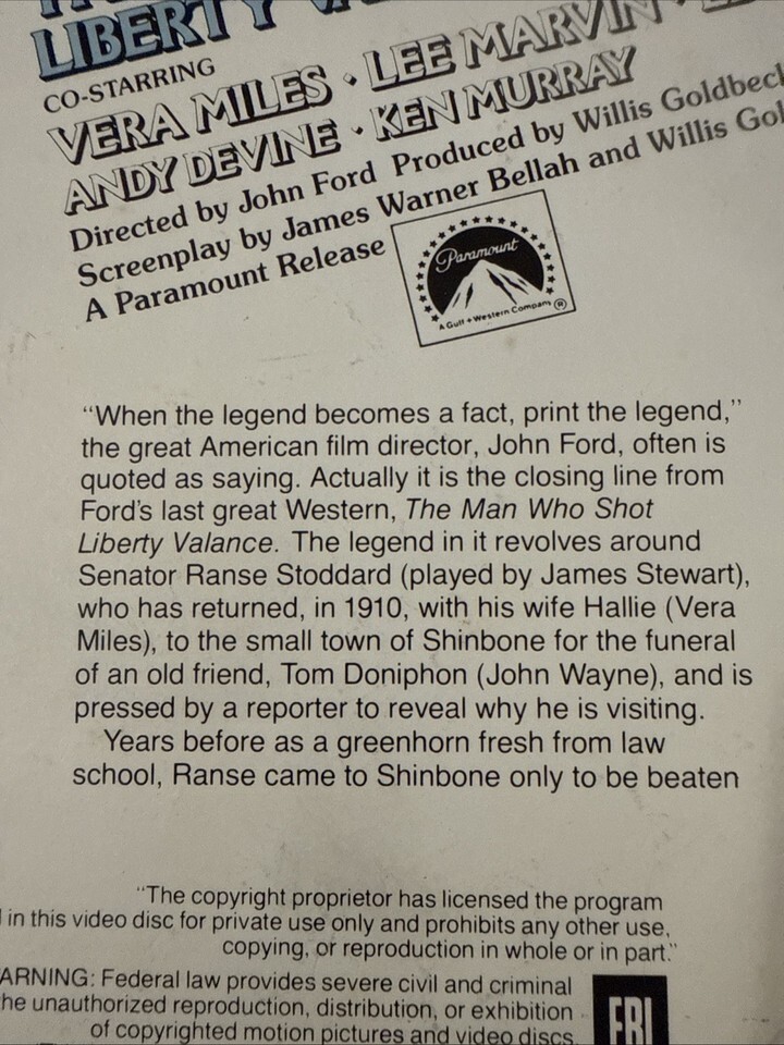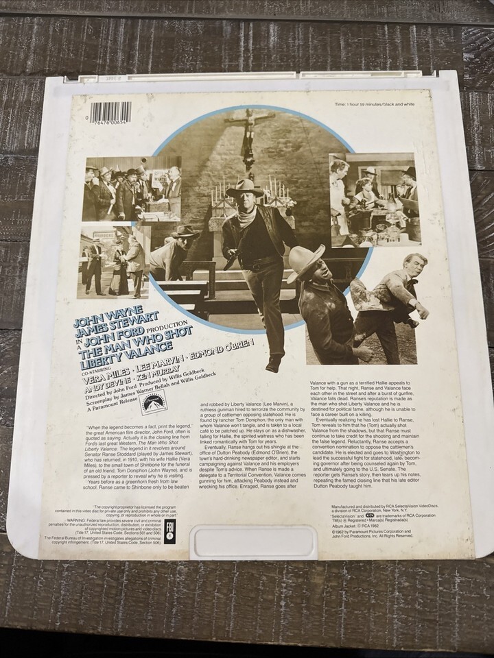 The RCA Videodisc of "The Man Who Shot Liberty Valance" offers a high-quality viewing experience of this classic movie. This format allows for superior picture quality and sound, making it a must-have for film enthusiasts. The video Disc is a vintage technology that provides a unique viewing experience, perfect for those who appreciate the nostalgia of older movie formats. The product is a valuable addition to any collection of videodisc or classic movies.