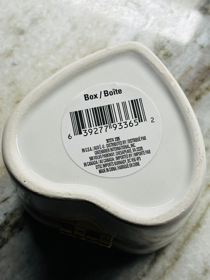 This heart-shaped trinket box by Greenbrier is a charming addition to your collection. The ceramic box comes with a push lock lid, making it perfect for storing your precious jewelry or other small trinkets. The box is beautifully designed with hearts and finished in a lovely shade of white, making it an ideal gift for Valentine's Day or any occasion.
