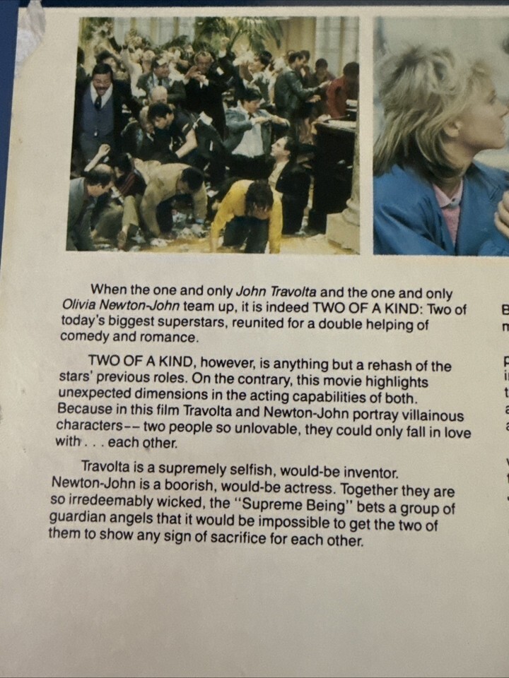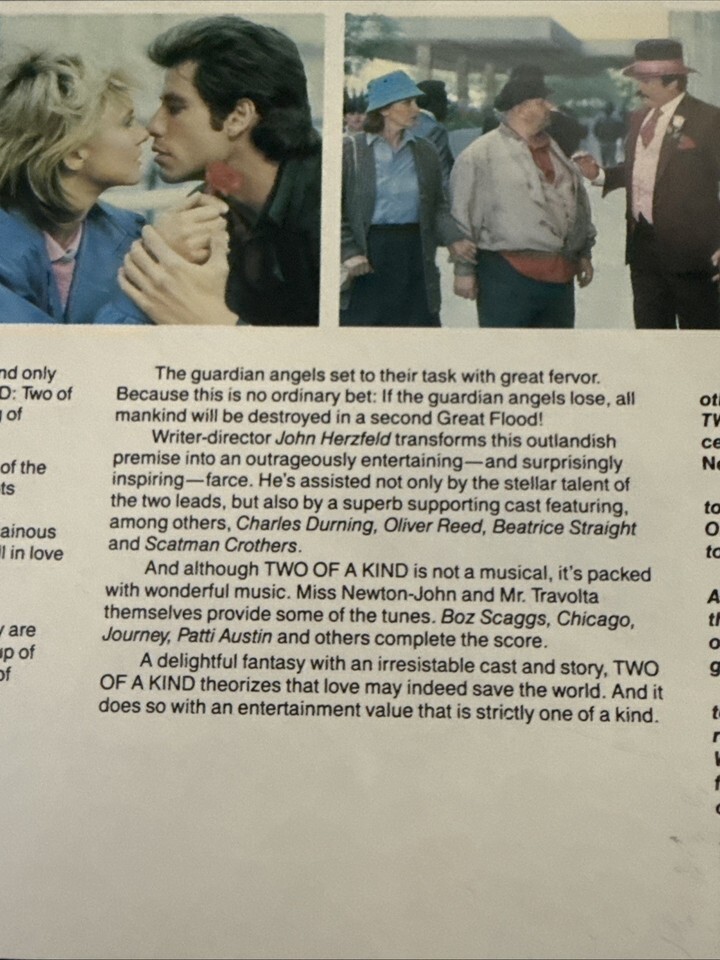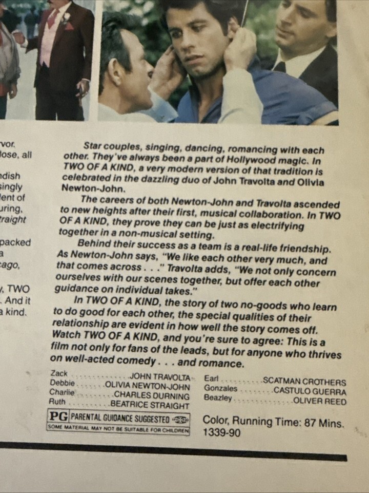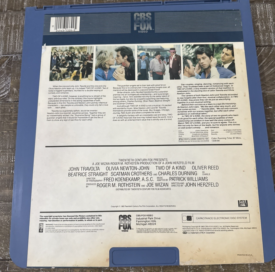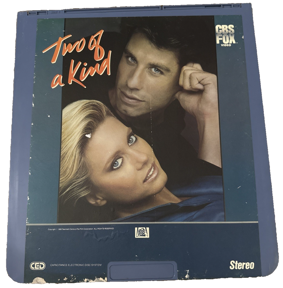 The product is a videodisc featuring the movie "Two of a Kind" starring CBS FOX. This vintage format offers high-quality video and sound, making it a unique collector's item for fans of classic movies. The videodisc allows for larger picture sizes and sharper images compared to VHS tapes or DVDs, providing an enhanced viewing experience for enthusiasts of the film.
