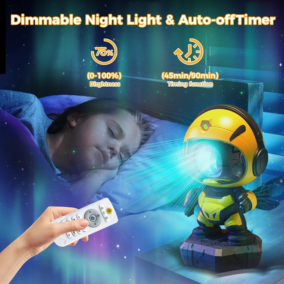 ?Unique Shape Design?It is different from the astronaut projection lamp image on the market, we combined elements of bees with mechanical armor,showing a sense of future and technology, the unique look makes you stand out.Our star galaxy projector head and arms have an adjustable angle design, you can adjust the projection direction by adjusting the angle of device head, and project the stars and nebula lamp to wherever you like, project The high-definition lens ensures clear and realistic projection effects on walls and ceilings.