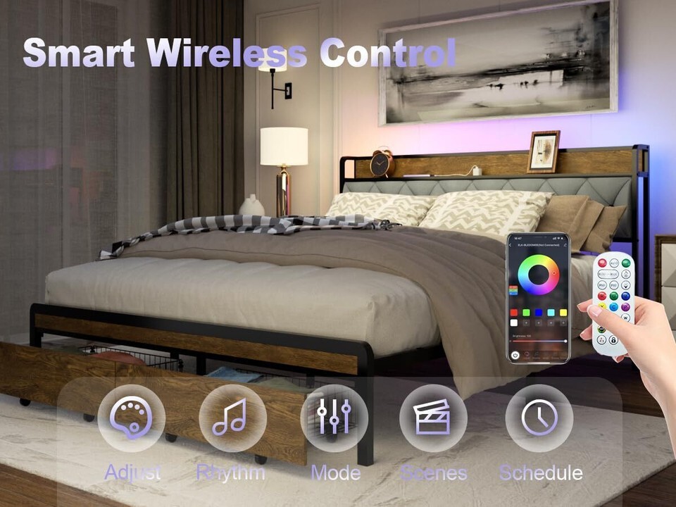 Marco Cama Con Plataforma Cabecero Respaldo Tapizado Queen con luces y 2 cajones