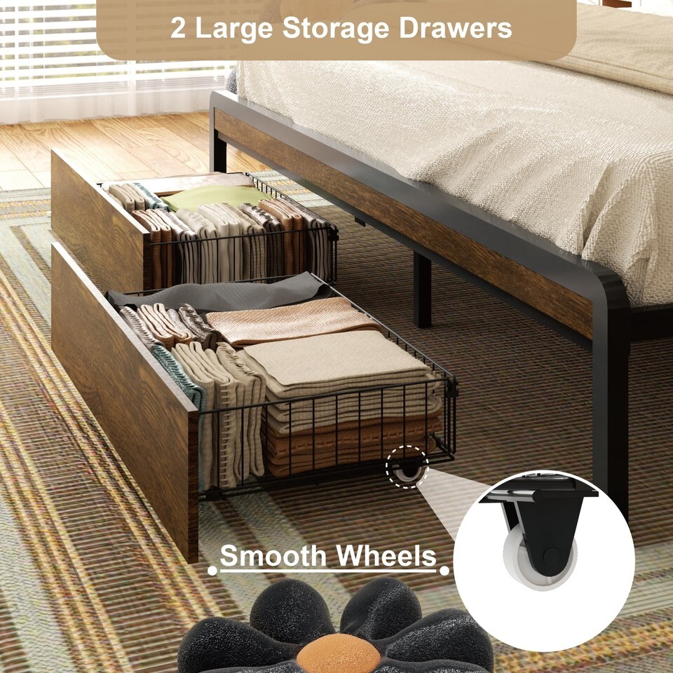 Thoughtful Storage Drawers: Organize with ease using 2 storage drawers seamlessly integrated into the bed frame, providing ample space to stow away bedding, linens, or personal items for a clutter-free bedroom
