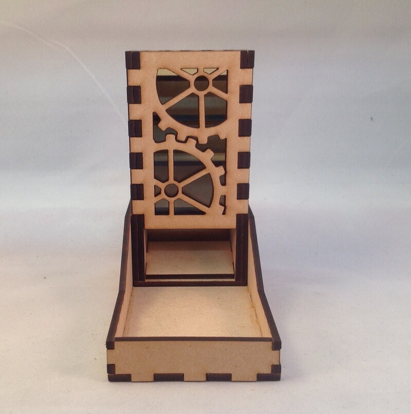 Gears Dice Tower & Tray Glass Green Acrylic Window COMPACT DESIGN Laser Cut MDF