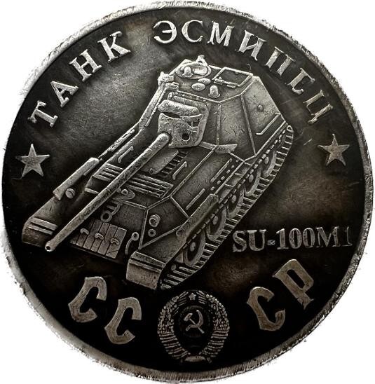 Discover the SU-100M1 Tank Collector's Fantasy Coin, a remarkable tribute to one of the most significant armored vehicles of World War II. This coin features an intricately detailed depiction of the Soviet tank SU-100M1, renowned for its maneuverability and powerful armament, showcasing the technological advancements of the Soviet military during that era. Above the tank's image, the inscription "???? ???????" (Tank Destroyer) highlights its crucial role in combat against enemy tanks. The lower portion of the coin includes the letters CCCP, a reference to the former Soviet Union, alongside the emblem of the USSR, adding substantial historical value to this collector's item. On the reverse side, you will find a classic representation of Soviet victory in 1945, featuring the central star symbolizing the Spasskaya Tower of the Kremlin, encircled by laurel branches and the inscription "??????" (Victory). The mention of "????????? ??????" indicates a nominal value of 50 rubles, though this coin is intended exclusively for collectors, not for circulation. Such coins were often created to commemorate the significant victories of the Great Patriotic War and to honor the achievements of the Soviet army. This SU-100M1 Tank Collector's Fantasy Coin is not only a unique conversation piece but also a meaningful addition to any military history collection.