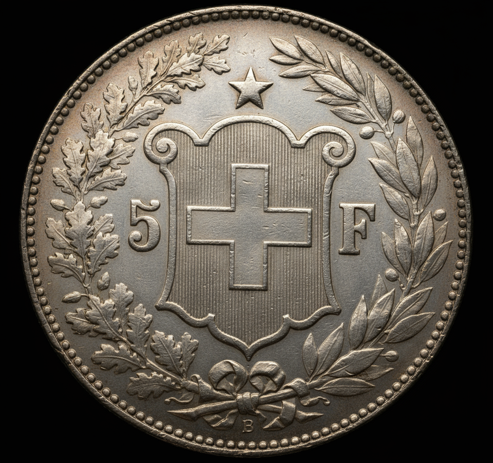 Swiss 5 Fr. Fantasy Medal Restrike – Historic Shield & Star Plated Numismati