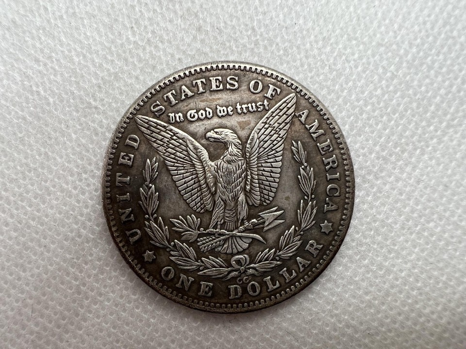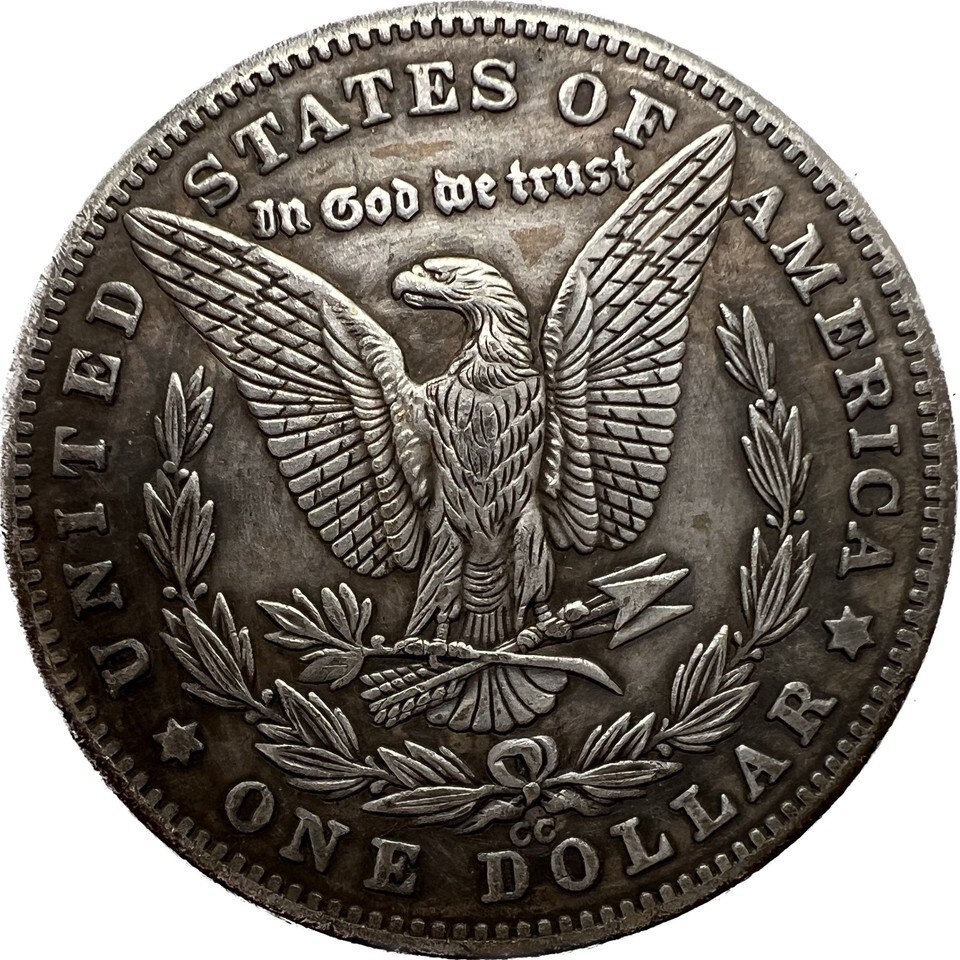 En el reverso, el clasico aguila americana se alza orgullosamente con sus alas extendidas, simbolizando fuerza y determinacion, un emblema duradero de la era de la expansion estadounidense. Esta creacion contemporanea honra el arte del grabado y la reinterpretacion imaginativa de la moneda historica, mezclando el pasado con elementos de fantasía.