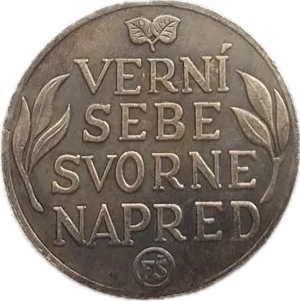 Le revers presente la devise emblematique de Sokol « V?RNÍ SOB?, SVORN? NAP?ED », completee par des motifs decoratifs de feuilles de tilleul, symboles traditionnels de l'identite tchecoslovaque. Cette replique meticuleusement concue adhere aux originaux historiques, ce qui en fait un ajout ideal pour les collectionneurs et a des fins educatives. Il offre un apercu unique de l'heritage culturel de la Premiere Republique et du mouvement Sokol, parfait pour ceux qui s'interessent au riche patrimoine de la Tchecoslovaquie.