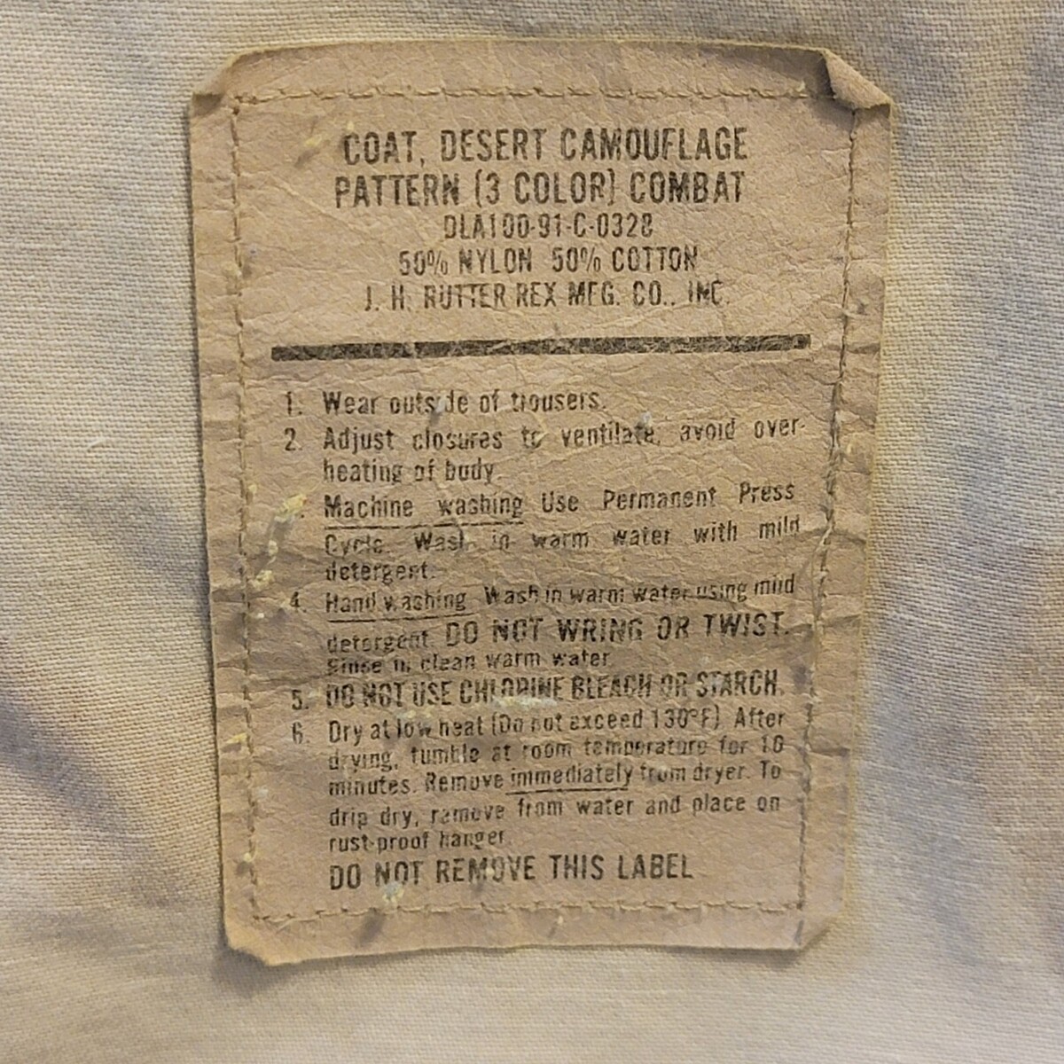 Excellent Condition Vintage US Military Air Force Desert Camo Field Jacket with 3 Patches - Men's Size Medium Regular. Actual measurements: 46" chest, 32.5" length. Fits at least a Large. 8415-01-327-5308. DLA100-91-C-0328. 50% Nylon / 50% Cotton. Made in USA. J.H. Rutter Rex MFG.
