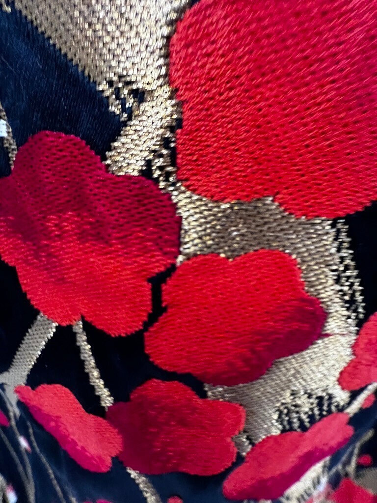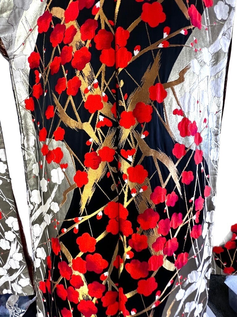 This stunning vintage wedding kimono black and gold with orange and white flowers. Very bright copper metallic lining. The material is silk with orange and white flowers....in great condition- there is only a seam out at the pit of the one sleeve (easily fixed). No flaws otherwise, no stains.