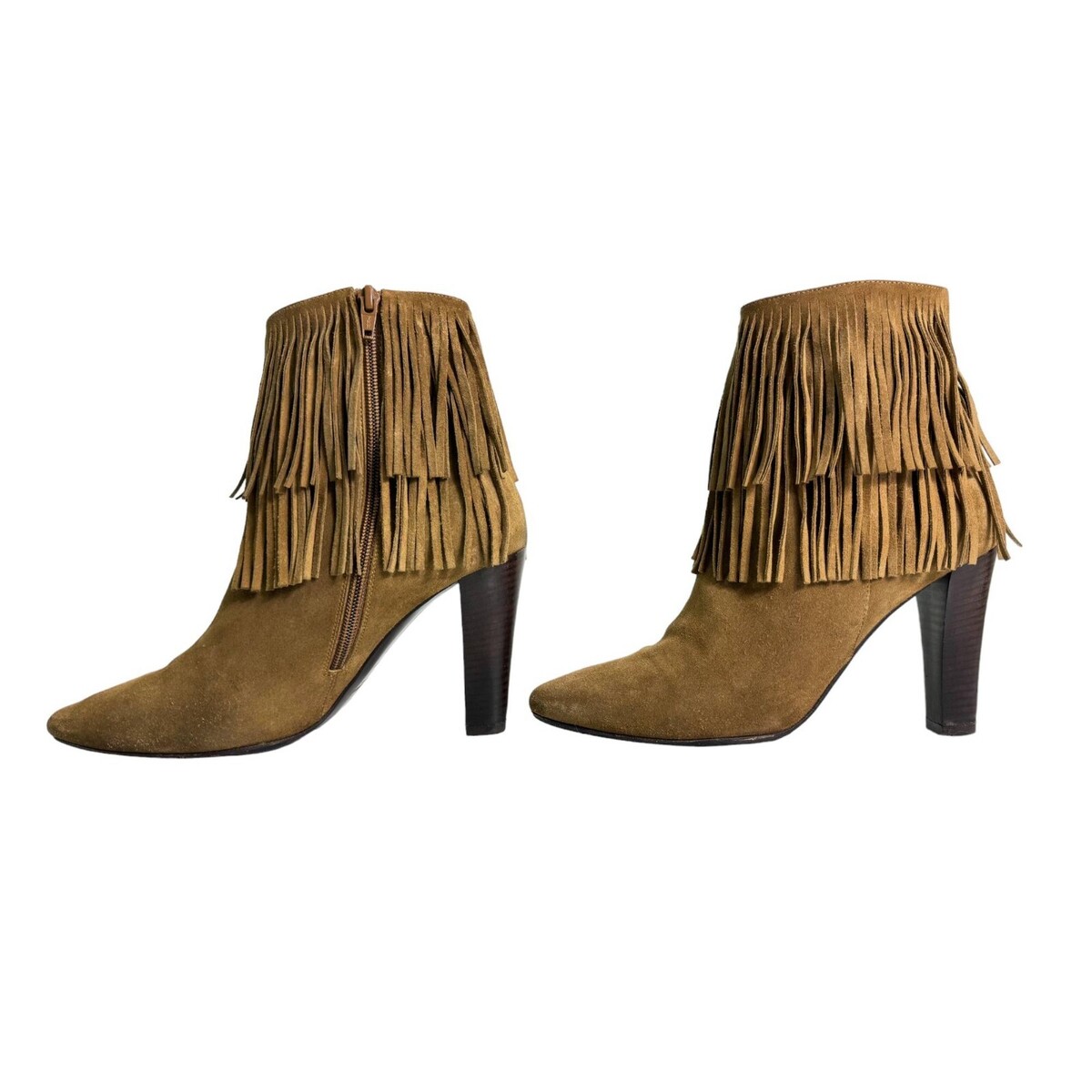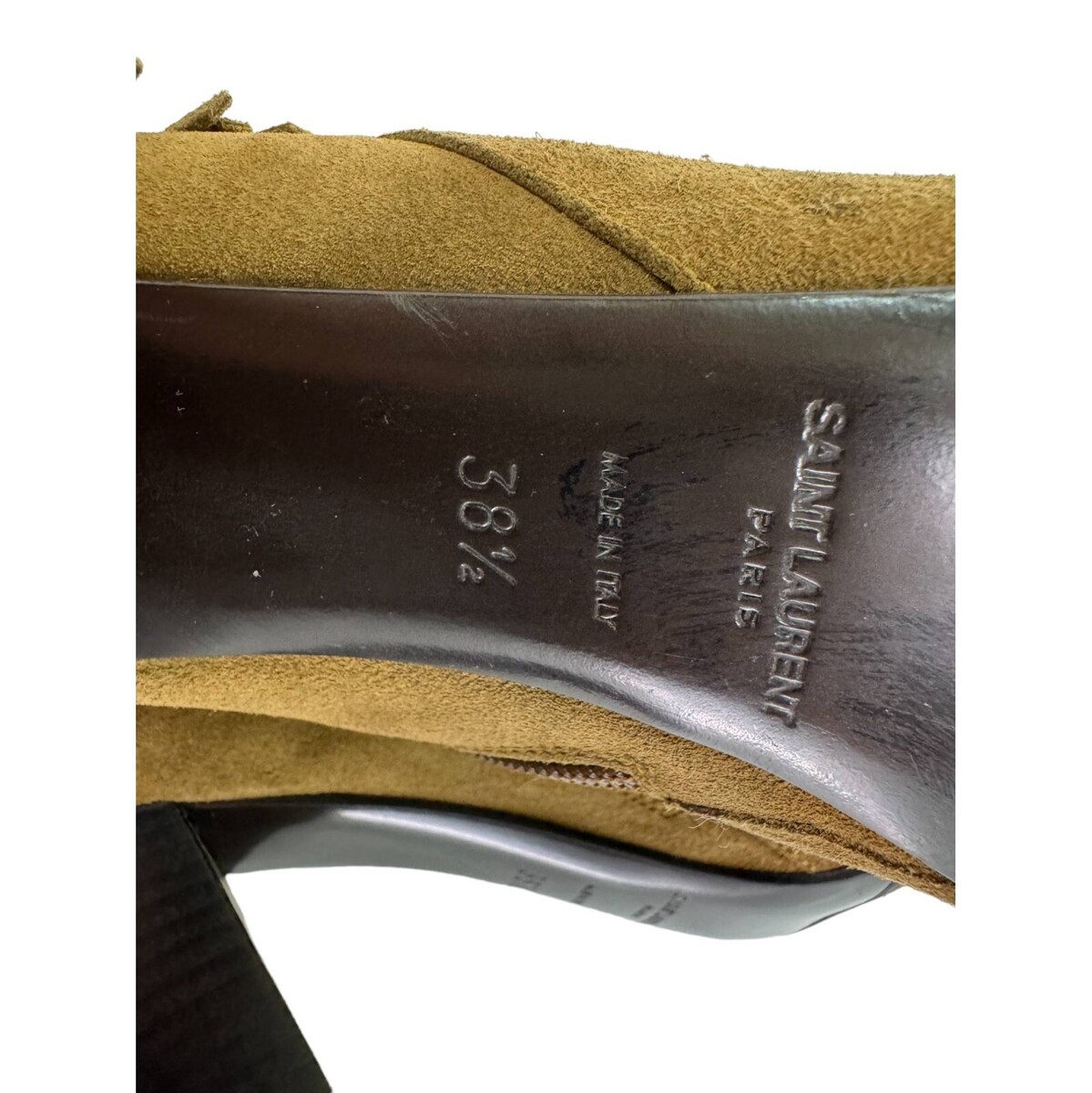 Saint Laurent Camel Beige Suede Fringe High Heels Almond Toe Ankle Booties Shoes 38.5
