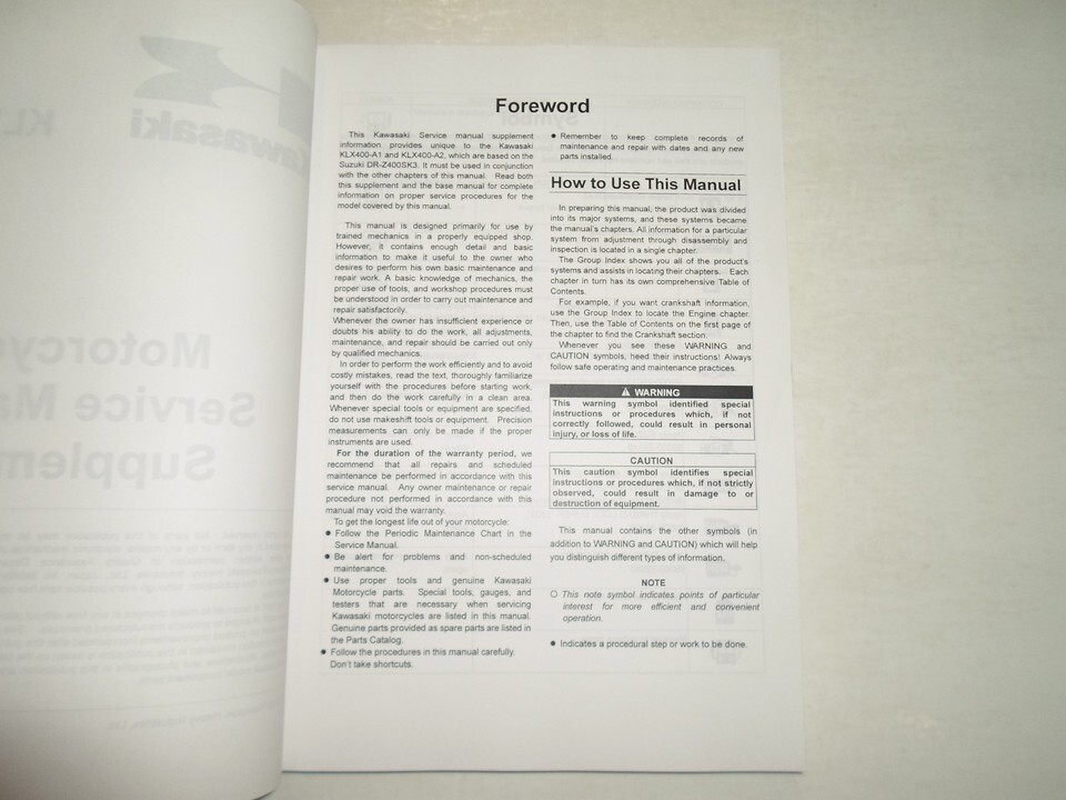 Couvrir l'attribution, pas de pages manquantes, des instructions etape par etape, un grand manuel a avoir lorsque vous possedez Kawasaki.