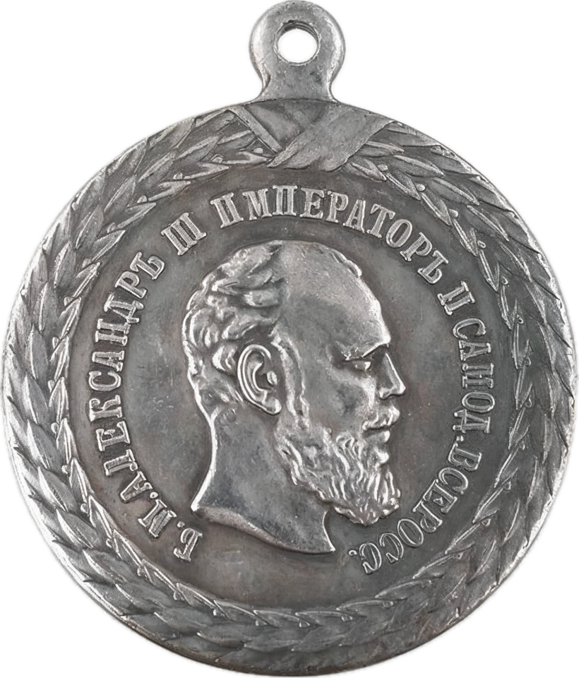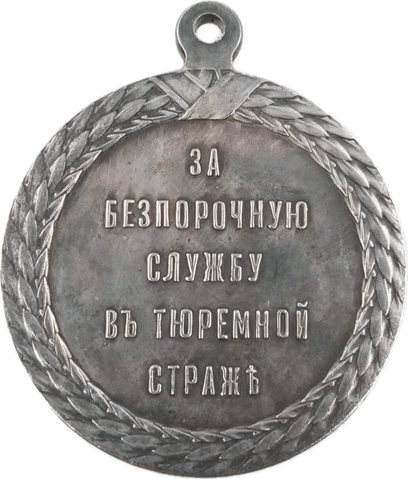 Questa sorprendente medaglia imperiale per l'impeccabile restrizione del servizio della guardia carceraria e stata assegnata per "??????????? ?????? ?? ???????? ??????" - "Servizio impeccabile nella guardia carceraria" - durante il regno dell'imperatore Alessandro II, il cui profilo finemente dettagliato domina il dritto. Circondato da una corona di alloro profondamente in rilievo e recante l'intero titolo imperiale, questo pezzo riflette sia l'autorita dell'Impero che il riconoscimento da parte dello stato di un servizio leale e di lunga data all'interno delle sue strutture di sicurezza interne. La classica scrittura cirillica, il motivo a nastro piegato nella parte superiore e l?attenta resa della somiglianza dell?imperatore sottolineano la natura formale e onorifica della medaglia.
