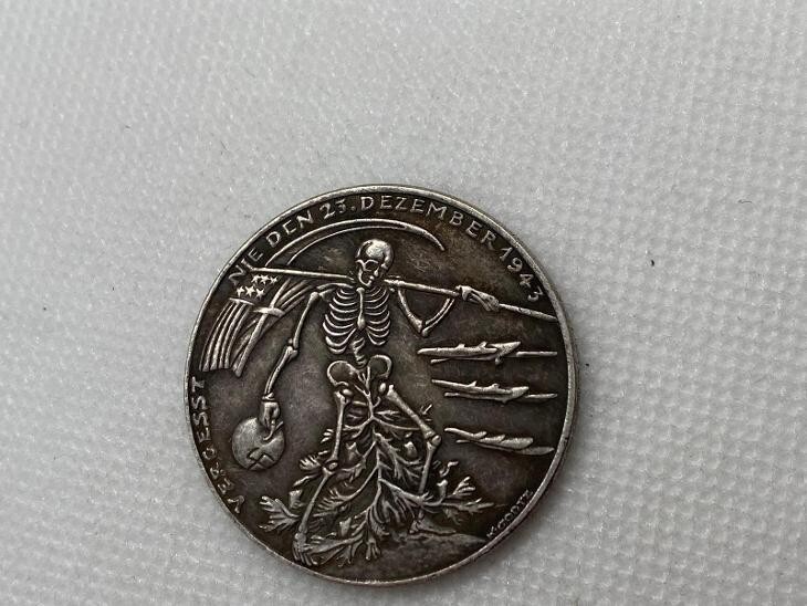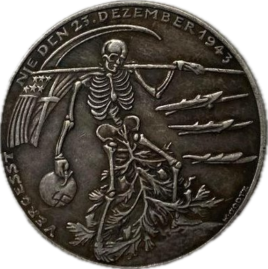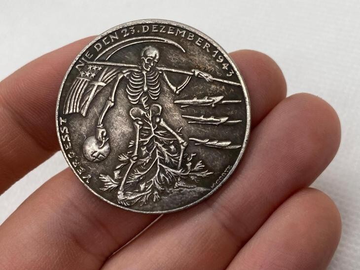 Na medailích jsou vyobrazeny sceny s tematikou bombardovaní a smrti, co? nazna?uje, ?e jsou pravd?podobn? pam?tními p?edm?ty, zaznamenavajícími n?jakou historickou udalost nebo období. První medaile ukazuje katedralu s napisem "BRIT.-AMERIKAS. BOMBEN AUF DEN KAISERDOM AACHEN", co? lze p?elo?it jako "Britsko-americke bomby na císa?skou katedralu v Cachach". Toto nazna?uje, ?e medaile je pravd?podobn? spojena s bombardovaním m?sta Aachen (Cachy) b?hem druhe sv?tove valky. Druha medaile s motivem smrtky a s napisem "DEN 23. DEZEMBER 1943" a "NEIN" nazna?uje odpor nebo protest proti udalostem, ktere se staly na tuto datum, pravd?podobn? take v souvislosti s bombardovaním b?hem valky.