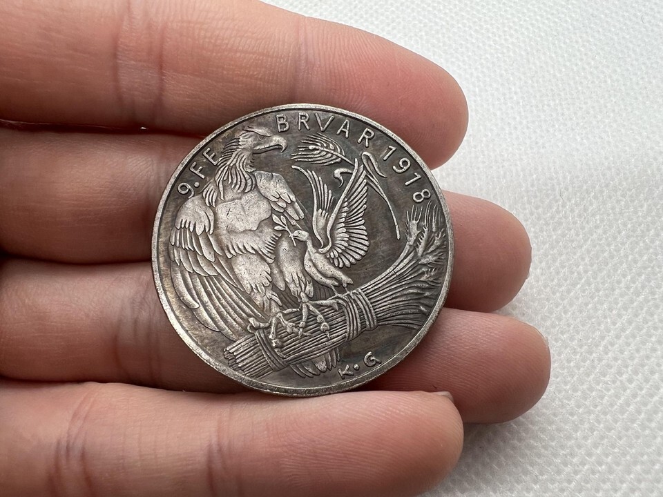 L'eccezionale medaglione della pace del 1918 con restrizione del simbolismo ucraino e un accattivante manufatto storico che commemora gli eventi significativi che segnarono la fine della prima guerra mondiale. Questo esemplare specifico e una restrizione precisa che conserva fedelmente tutti gli intricati dettagli della moneta originale. Il dritto presenta un albero simbolico ornato da una corona piena di frutti, intrecciato da una spada e un sole con un volto, che rappresenta la pace e la fertilita. L'iscrizione "FRIEDE MIT DER UKRAINE" (Pace con l'Ucraina) accanto alla parola "BRODT" (pane) infonde a questo medaglione un significato profondo nel contesto dell'accordo di pace e della ripresa agricola. Sul retro, un'aquila, emblematica del potere tedesco, regge un ramo d'ulivo accompagnato da un uccellino piรน piccolo che simboleggia la pace. La data "9. Febbraio 1918" commemora il giorno in cui fu firmato il trattato di pace di Brest-Litovsk tra gli Imperi Centrali e la Repubblica Popolare Ucraina. Questa restrizione e un'aggiunta eccellente per qualsiasi collezionista interessato alla storia della prima guerra mondiale e ai trattati di pace. Il suo aspetto autentico e il contesto storico lo rendono un pezzo da collezione prezioso e intrigante.