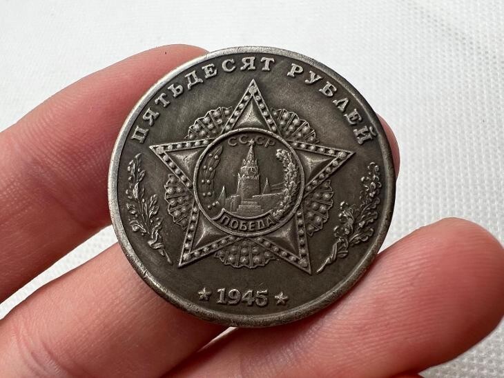 Auf der Vorderseite der Medaille ist der Panzer mit markantem Realismus dargestellt, begleitet von der kyrillischen Inschrift "???? ???????", was übersetzt "Panzerzerstorer" bedeutet. Die Rückseite zeigt den sowjetischen Siegesorden von 1945, eine der hochsten militarischen Auszeichnungen der UdSSR, die außergewohnliche Verdienste bei der Führung großer militarischer Operationen symbolisiert, die zur Niederlage Nazi-Deutschlands führten. Im Mittelpunkt dieses Designs steht der ikonische Spasskaja-Turm des Kremls, umgeben von Sternen und Lorbeerblattern, der die reiche Geschichte und Tapferkeit des sowjetischen Militars verkorpert.