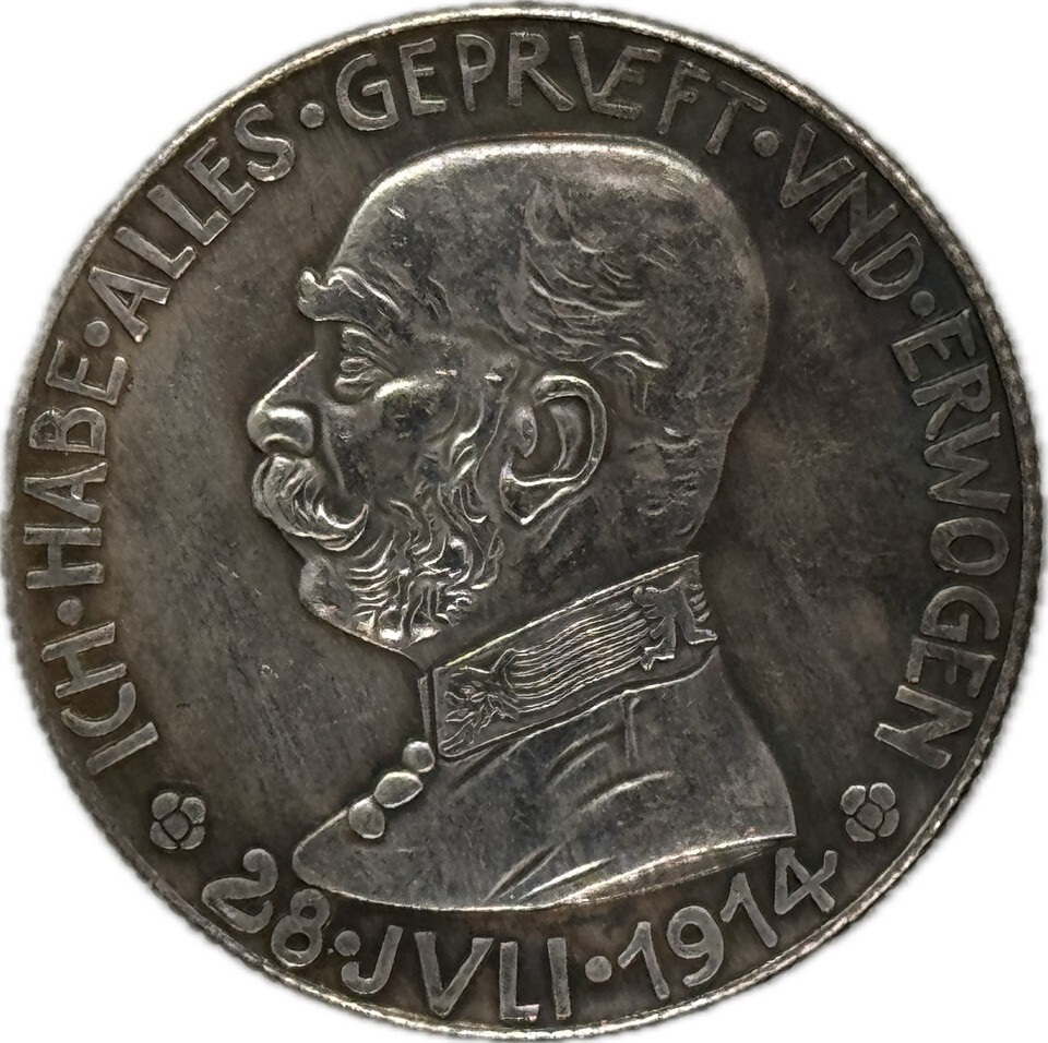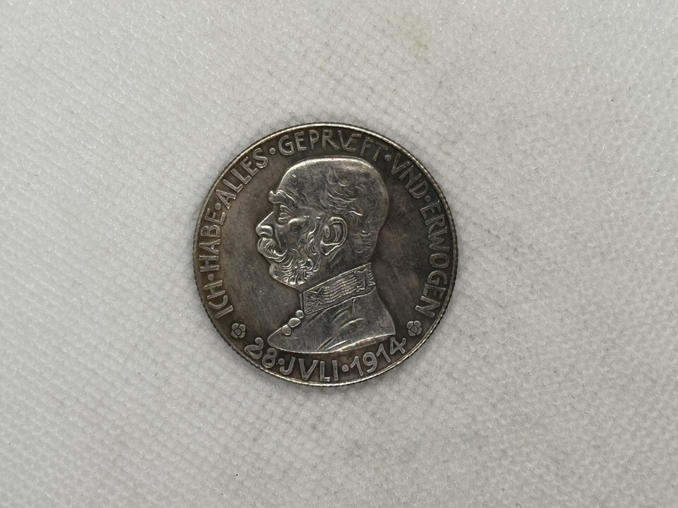 Diese historisch bedeutsame Gedenkmedaille stammt aus der Zeit des Ersten Weltkriegs und zeigt das Portrat von Kaiser Franz Joseph I., einem der am langsten regierenden Monarchen des Habsburgerreiches. Die Vorderseite zeigt sein Profil mit ausgepragten Zügen, umgeben von der Inschrift ?ICH HABE ALLES GEPRÜFT UND ERWOGEN-28. JULI 1914?, was übersetzt ?Ich habe alles gewogen und betrachtet ? 28. Juli 1914.? Dieses Datum markiert die offizielle Kriegserklarung an Serbien, ein entscheidender Moment, der zum Beginn eines globalen Konflikts führte.