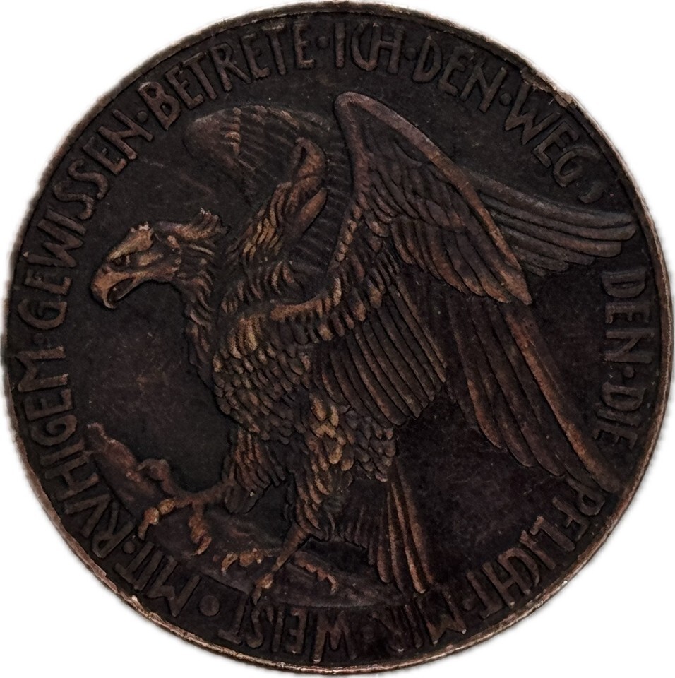 Auf der Rückseite erregt ein imposanter osterreichischer Adler mit ausgestreckten Flügeln Aufmerksamkeit und symbolisiert sowohl Dominanz als auch ein Gefühl der Vorahnung. Begleitet wird diese markante Bildsprache von der Inschrift ?MIT RAHIGEN GEWISSEN BETRETE ICH DEN WEG DEN DIE PFICHT MIR WEISS?, die den nationalistischen Eifer der Zeit und die Entschlossenheit der Monarchie, ihre Interessen zu verteidigen, betont.