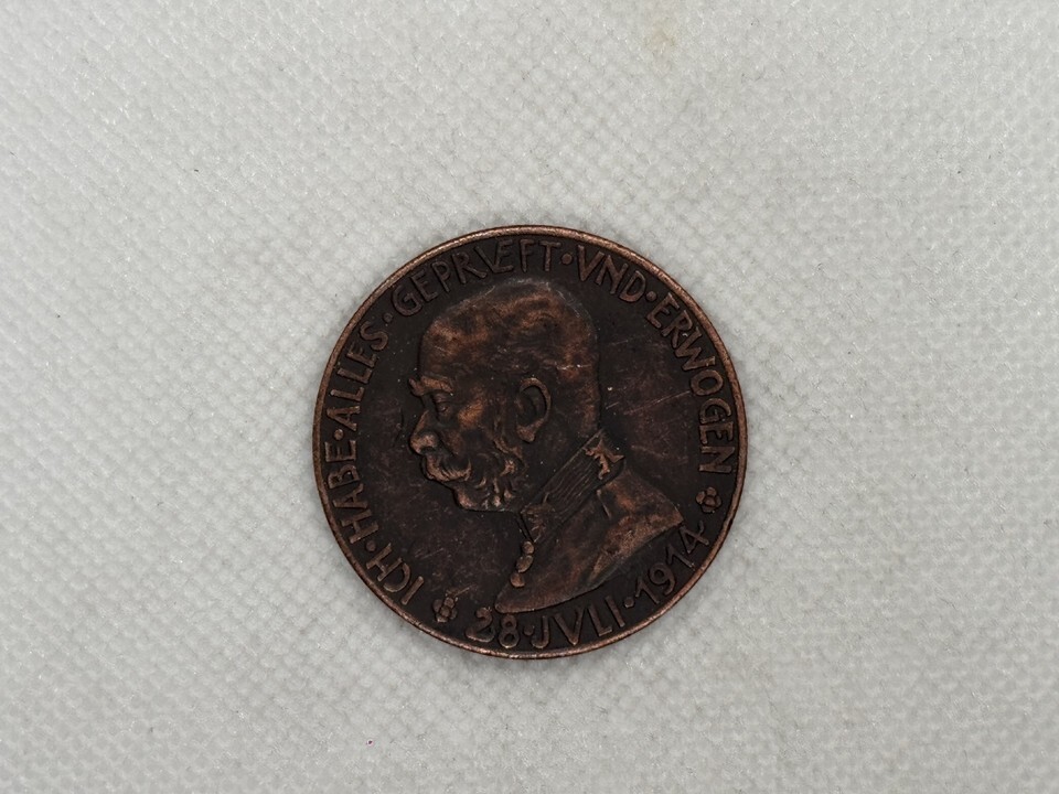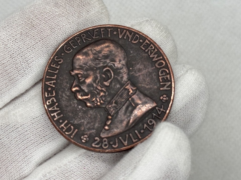 Entdecken Sie mit der Franz Joseph I. Fantasie-Gedenkmedaille - Kriegserklarung 1914 ein bedeutendes Stück Geschichte. Diese 1914 zu Beginn des Ersten Weltkriegs gepragte Gedenkmedaille zeigt ein detailliertes Portrat von Kaiser Franz Joseph I., der von 1848 bis 1916 regierte und damit die langste Herrschaft in der Geschichte der Habsburgermonarchie markierte. Die Vorderseite tragt die deutsche Inschrift ?ICH HABE ALLES GEPRÜFT UND GEWOGEN?, die die schwere Entscheidung Osterreich-Ungarns widerspiegelt, in den Krieg einzutreten.