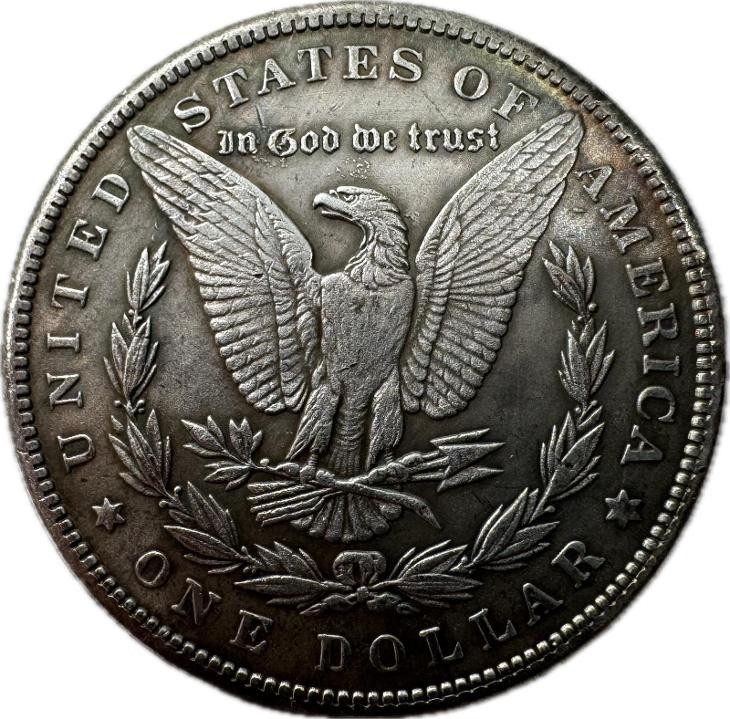 Il retro mantiene il design classico del dollaro Morgan, mostrando una maestosa aquila con le ali tese, che stringe un ramo d'ulivo e frecce, simboleggiando pace e prontezza alla difesa. L'iscrizione "In God We Trust" riecheggia le dimensioni spirituali e religiose dell'identita americana. Nel complesso, questa medaglia rappresenta una miscela armoniosa di elementi artistici tradizionali e contemporanei, rendendola un pezzo attraente sia per i collezionisti che per gli appassionati d'arte.
