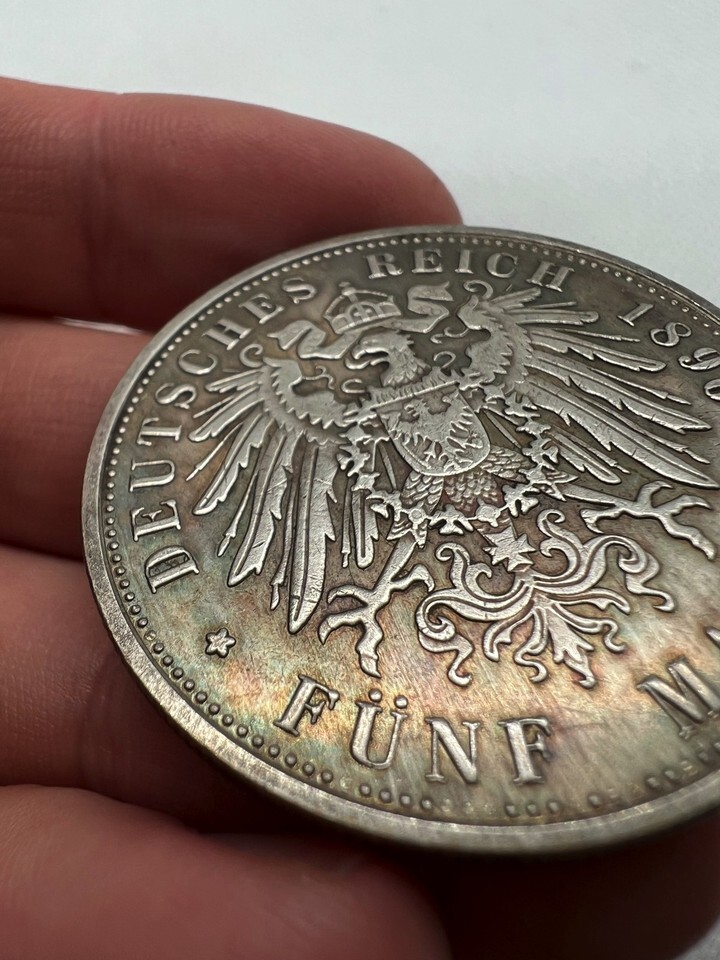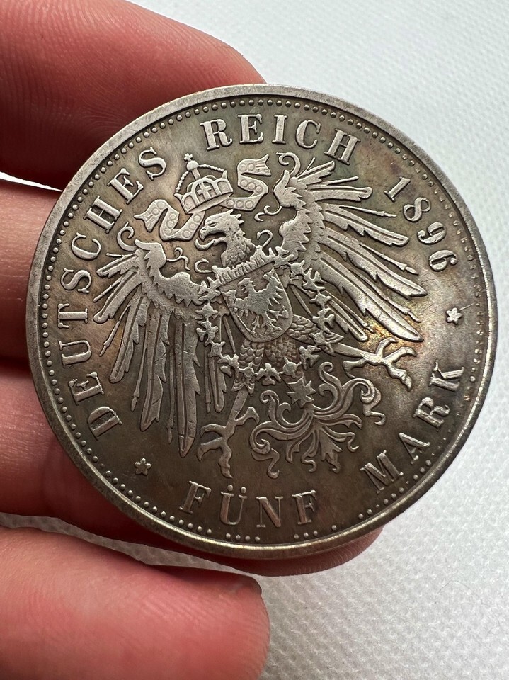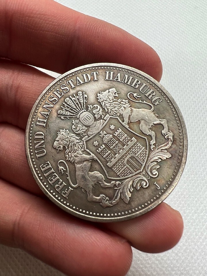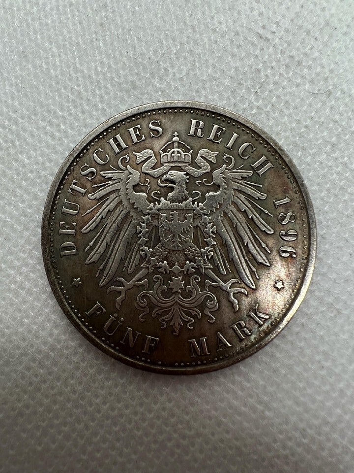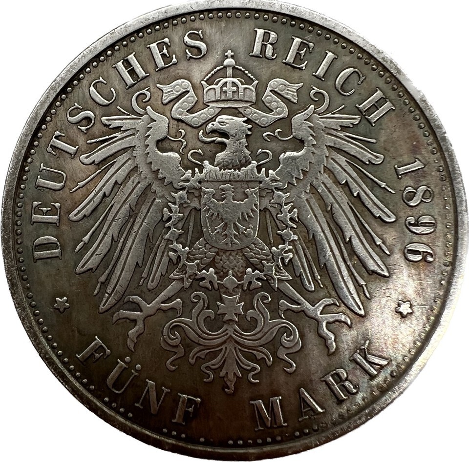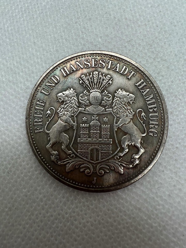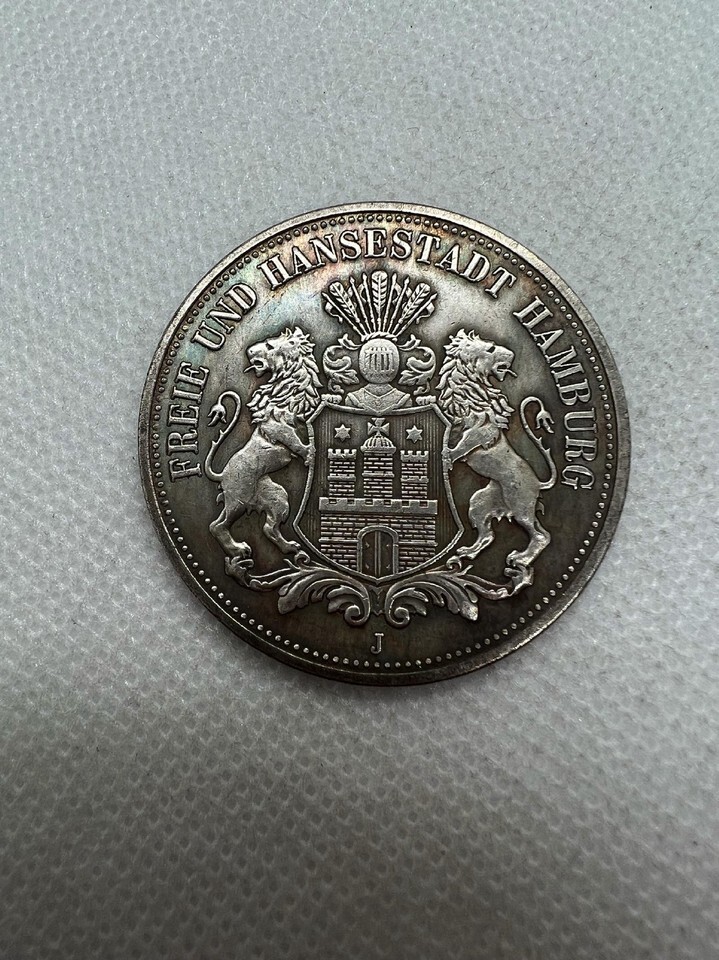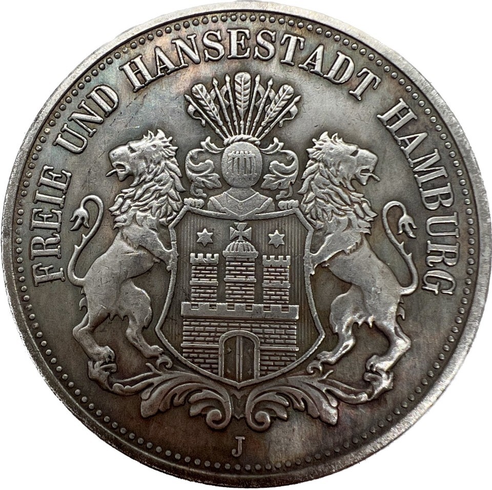 Su un lato della medaglia, troverai il maestoso stemma della citta anseatica di Amburgo, accompagnato dalla scritta "FREI UND HANSESTADT HAMBURG", che sottolinea l'importanza storica e l'indipendenza della citta come entita libera e anseatica. Il retro mostra con orgoglio lo stemma imperiale tedesco, caratterizzato dall'iconica aquila a due teste, accanto alla scritta "DEUTSCHES RICH 1896" e alla denominazione "CINQUE MARCHI". Questo simbolo emblematico rappresenta un'epoca cruciale nella storia tedesca, racchiudendo lo spirito dell'Impero tedesco dal 1871 al 1918.