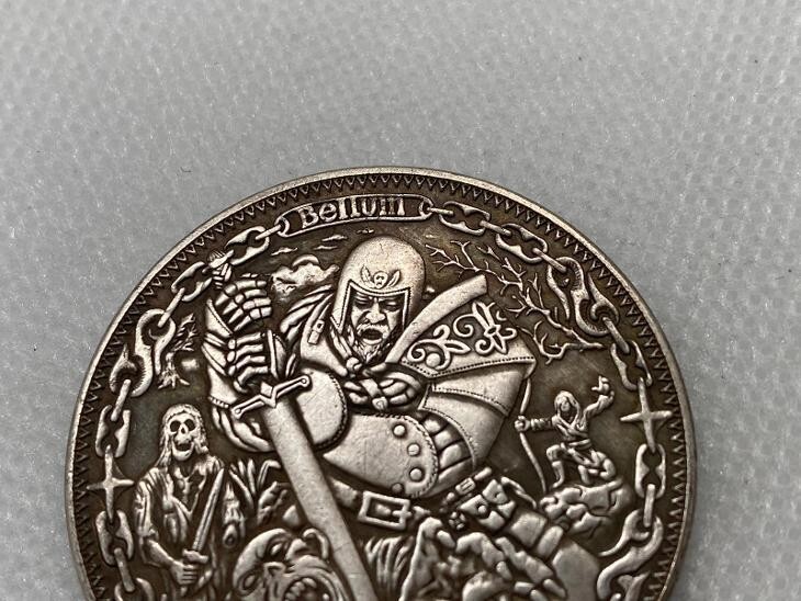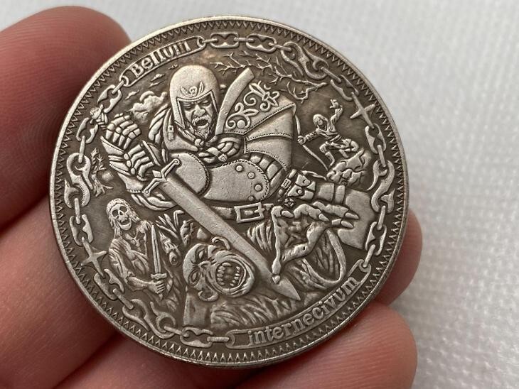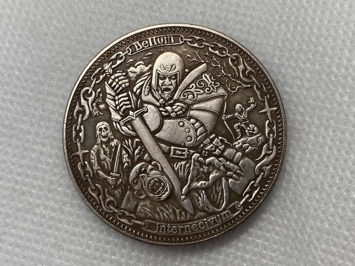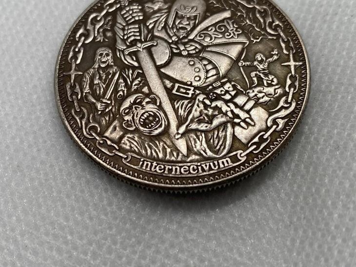Scopri la Warrior Internicivum - Fantasy Coin Collection, una notevole reinterpretazione del classico dollaro americano che trascende gli standard numismatici tradizionali. Questa suggestiva moneta presenta una rappresentazione moderna di un guerriero che brandisce una spada colossale, circondato da figure spaventose, creando una potente rappresentazione dell'eterna battaglia tra il bene e il male. Il dritto mostra un'antica scena di guerra, ricca di dettagli drammatici, che sottolinea l'eroismo e il valore del guerriero. L'iscrizione "Internicivum", che significa "guerra devastante", aggiunge uno strato di significato storico e arte contemporanea a questo straordinario pezzo. Al contrario, il retro conserva l'iconico emblema americano: un'aquila svettante con le ali tese, che stringe un fascio di frecce nei suoi artigli, simboleggiando la forza e la protezione degli Stati Uniti. Questo design rappresenta da tempo i valori di indipendenza e resilienza che l'America rappresenta. L'unicita di questa moneta risiede nel sorprendente contrasto tra i suoi design moderni e tradizionali, rendendola un oggetto ambito per i collezionisti. La rappresentazione dettagliata delle scene di combattimento sul dritto completa il classico design del rovescio, risultando in un eccezionale pezzo da collezione che migliorera qualsiasi collezione.