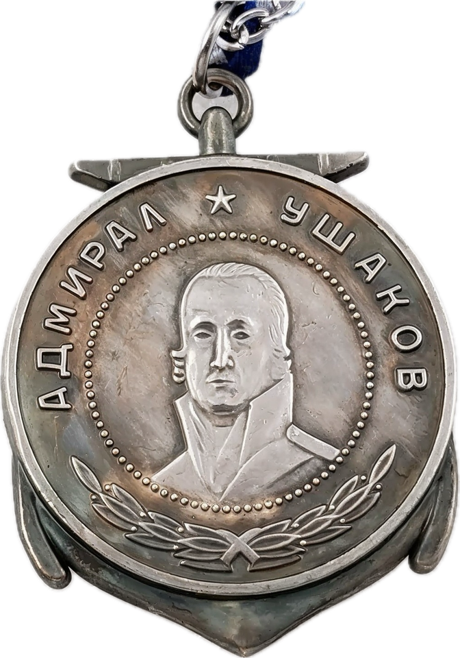 L'Ordre d'Ouchakov est l'une des decorations militaires sovietiques les plus prestigieuses, creee en 1944 pendant la Seconde Guerre mondiale pour honorer des realisations exceptionnelles dans le commandement naval. Nomme d?apres l?amiral Fiodor Ouchakov, l?un des plus grands strateges navals russes du XVIIIe siecle, cet ordre a ete decerne aux officiers de marine sovietiques pour leur leadership exceptionnel et leur ingeniosite tactique. Le dessin presente en evidence un portrait detaille en relief d'Ouchakov, entoure de son nom en cyrillique ("??????? ??????") et une couronne de laurier, symbolisant l'excellence martiale et la bravoure. Le revers affiche une grande ancre, renforcant son importance maritime. L'ordre etait traditionnellement decerne a des officiers de haut rang de la marine sovietique, reconnaissant souvent de brillantes operations navales et des victoires strategiques. Cette piece particuliere est une reproduction moderne, soigneusement concue pour preserver le design original et l'authenticite historique. La medaille est suspendue a un ruban raye bleu et blanc distinctif, un choix de conception refletant son lien avec les traditions navales sovietiques et plus tard russes. Les collectionneurs et les amateurs d'histoire apprecieront les details fins et la pertinence historique de cette reproduction, ce qui en fait un ajout precieux a toute collection de prix et de souvenirs militaires de l'ere sovietique. Bien qu'il ne s'agisse pas d'un numero original en temps de guerre, il reste un hommage frappant a l'un des plus hauts honneurs navals de l'Union sovietique.