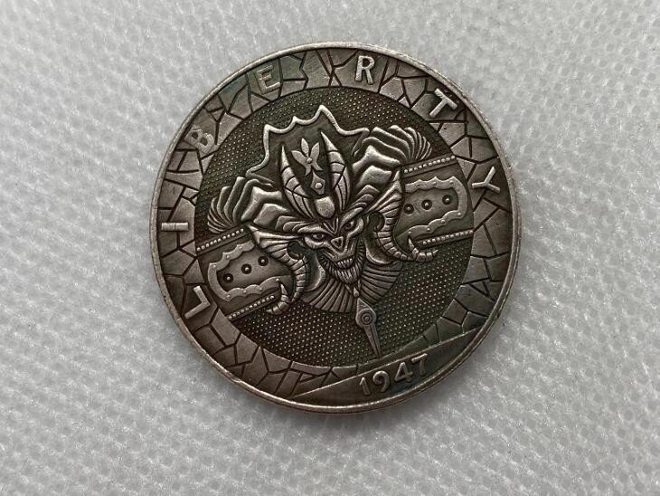 Esta moneda de fantasía de medio dolar Liberty 1947 meticulosamente elaborada es una mezcla única de significado historico y estilo artístico. Con un diseño intrincado que pasa de temas goticos a demoníacos, el anverso muestra un rostro demoníaco magistralmente grabado que cautiva con sus detalles claramente definidos y su cuidadoso sombreado. Esta moneda ejemplifica el arte de los níquel hobo, monedas que han sido modificadas artísticamente para una estetica única. El reverso muestra el iconico aguila americana, complementado con la inscripcion "E Pluribus Unum" y la denominacion de medio dolar. A pesar de sus mejoras modernas, esta moneda conserva un profundo contexto historico, atrayendo a los coleccionistas que buscan una fusion distintiva de arte contemporaneo y valor historico. Se erige como un testimonio notable de las habilidades de los grabadores centrados en la renovacion y transformacion de artefactos numismaticos, creando piezas artísticas únicas en su tipo. Esta moneda es una adicion excepcional para cualquier coleccionista de monedas raras e inusuales.
