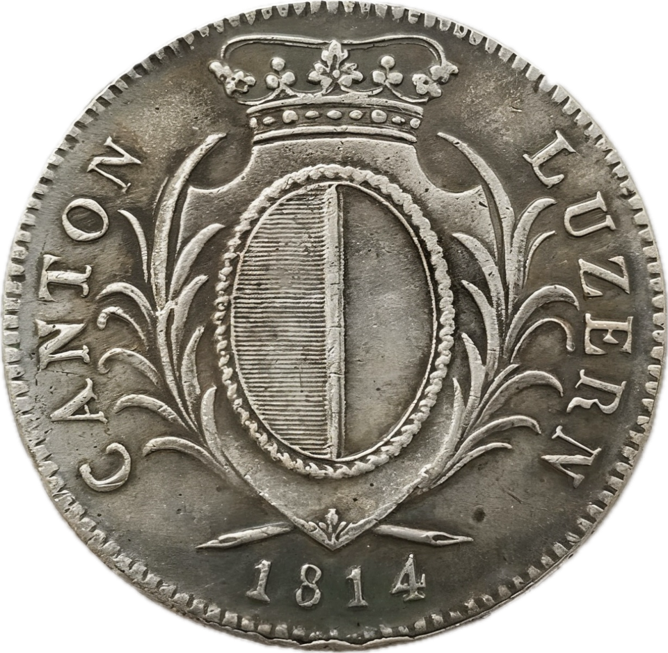 Cette piece meticuleusement concue rend hommage au canton de Lucerne en 1814, une epoque où la Suisse consolidait son identite apres les bouleversements de l'epoque napoleonienne. Au revers, nous trouvons les majestueux armoiries couronnees de Lucerne, finement encadrees par des branches d'olivier symbolisant la paix et la prosperite. L'annee 1814 marque la periode peu apres l'Acte de mediation, lorsque Lucerne a de nouveau ete etablie comme l'un des cantons importants de la Confederation suisse, jouant un role cle dans la restauration post-napoleonienne de la souverainete cantonale.