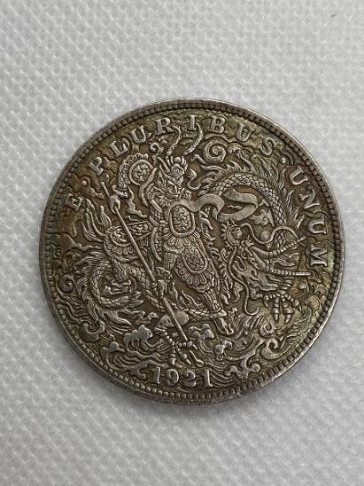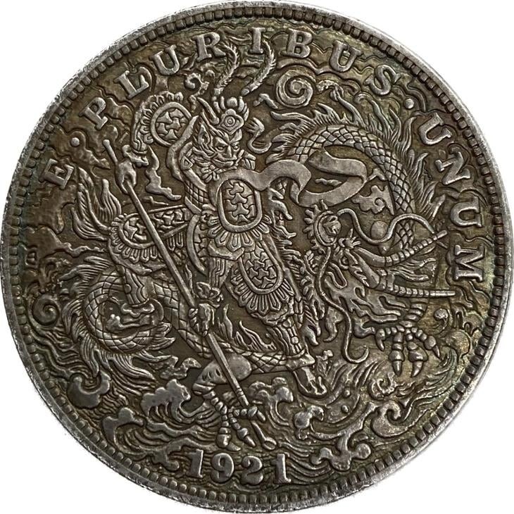 Esta medalla única combina magistralmente el iconico diseño del dolar estadounidense con cautivadores motivos orientales, por lo que es una adicion intrigante para los coleccionistas interesados ??en artículos numismaticos exoticos e inusuales. El anverso cuenta con un valiente guerrero a caballo comprometido en la batalla con un dragon, un poderoso símbolo en las culturas asiaticas que representa coraje, proteccion y fuerza. Estas llamativas imagenes estan enmarcadas por la frase ?E Pluribus Unum? y el año 1921, que se remontan a motivos celebres encontrados en las monedas de dolar estadounidense. Los exquisitos detalles tanto del guerrero como del dragon imparten un valor artístico significativo a esta medalla.