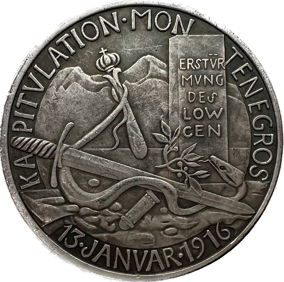 Le revers presente une representation vivante de la campagne militaire, inscrite avec les phrases "Erstürmung des Lov?en" (Assaut de Lov?en) et "Kapitulation du Montenegro" (Capitulation du Montenegro). Cette date importante du 13 janvier 1916 marque la reddition officielle du Montenegro alors qu'il etait occupe par les forces austro-hongroises sous le commandement du general von Kovess, marquant un moment charniere dans la guerre qui a conduit a la fin de l'independance du Montenegrin et a son annexion a l'Empire austro-hongrois.