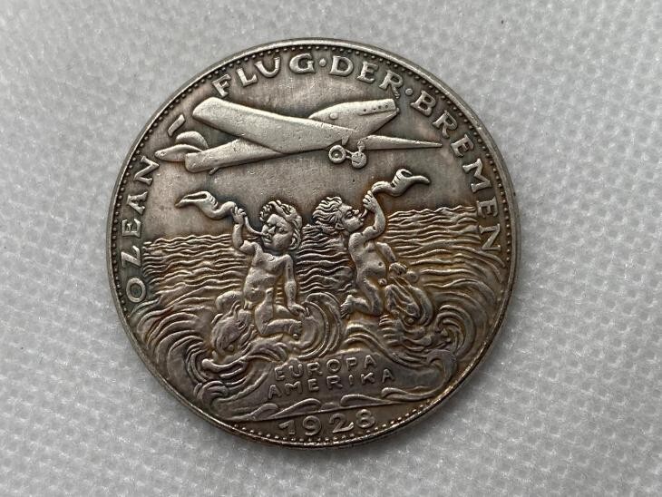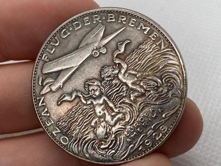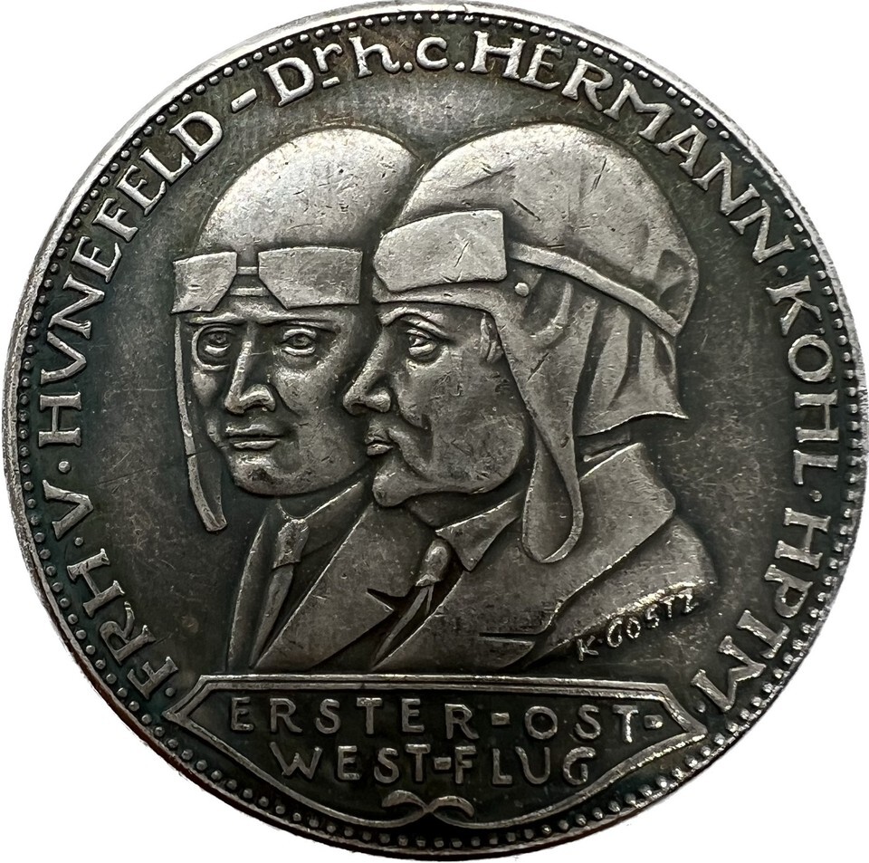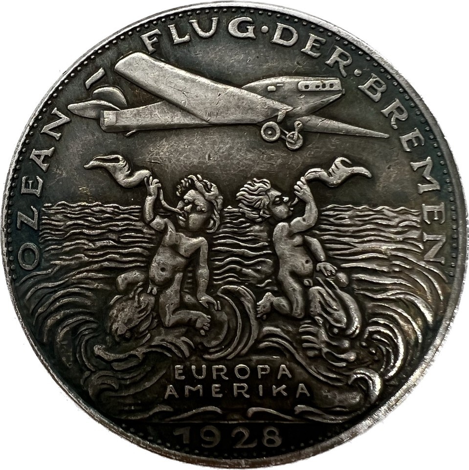 Esta medalla conmemorativa, acuñada en 1928, celebra el vuelo pionero del Bremen, el primer avion aleman en cruzar con exito el Oceano Atlantico de este a oeste. El anverso de la medalla presenta la representacion simbolica de este viaje oceanico, mostrando el avion elevandose sobre una superficie de agua estilizada, acompañado de dos figuras de tritones. Estos personajes míticos rinden homenaje a las antiguas tradiciones marítimas, que encarnan la conexion entre Europa y America. En el reverso, la medalla muestra los retratos de los dos pilotos principales de esta mision historica: Ehrenfried Günther Freiherr von Hünefeld y Hermann Kohl, que hicieron contribuciones duraderas a la historia de la aviacion.