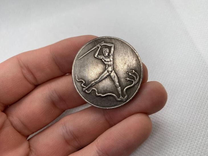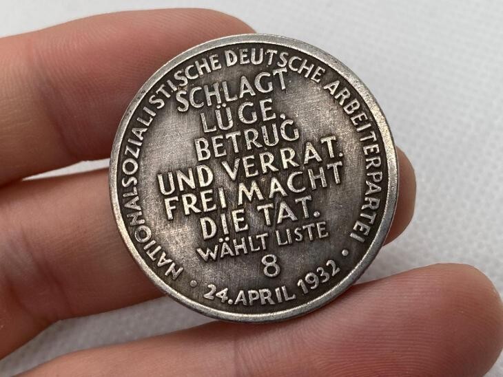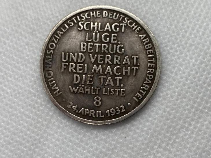 Esta moneda de fantasía historica - motivo anti-traicion 1932 es un notable coleccionable que proporciona una vision única del clima político y cultural de principios del siglo XX. Sorprendentemente diseñada, esta moneda cuenta con una figura mítica que lucha contra una serpiente en un lado, simbolizando la eterna lucha entre el bien y el mal, un motivo utilizado con frecuencia en el arte propagandístico para expresar ideales políticos. En el reverso, la moneda lleva una inscripcion en aleman, que se traduce en: "El Partido Nacionalsocialista Obrero Aleman lucha contra la mentira, el engaño y la traicion. La libertad hace accion. Vota por la lista número 8. 24 de abril de 1932." Esta fecha significa un momento crucial en la historia alemana, coincidiendo con las elecciones que jugaron un papel crucial en el surgimiento del Partido Nazi. Esta pieza sirve no solo como un artefacto político sino tambien como un medio a traves del cual se difundieron ideas y creencias específicas en el discurso público. Refleja las formas en que la maquina de propaganda nazi aprovecho el simbolismo y la estetica para reforzar su influencia en la opinion pública. Tenga en cuenta que este artículo esta hecho como una reproduccion y esta destinado únicamente para fines de coleccionista. Afirmamos que no estamos afiliados a ningún movimiento que tenga como objetivo suprimir los derechos humanos o promover animosidades nacionales, raciales o de clase. Se recuerda a los compradores que este artículo se vende exclusivamente con fines educativos, de investigacion, artísticos o informativos sobre eventos actuales o historicos. Al comprar este producto, los compradores confirman que lo adquieren para los fines antes mencionados. Bajo ninguna circunstancia se venderan estos artículos para promover ninguna ideología. Para cualquier consulta, no dude en ponerse en contacto con nosotros.