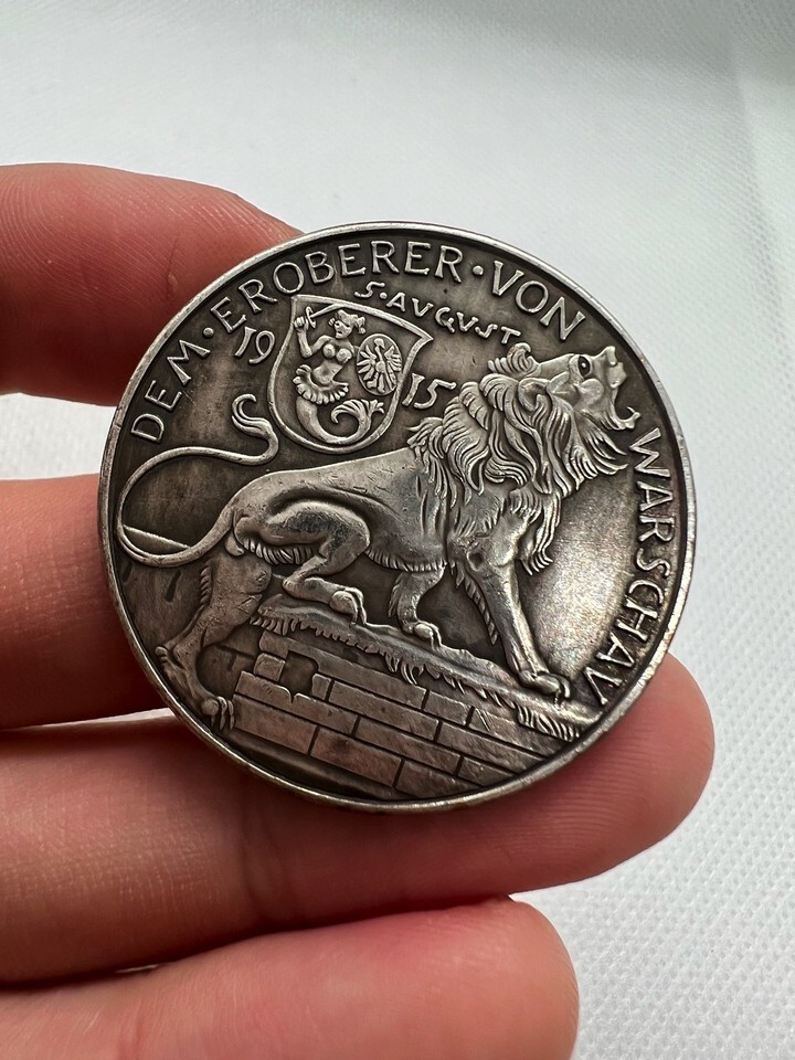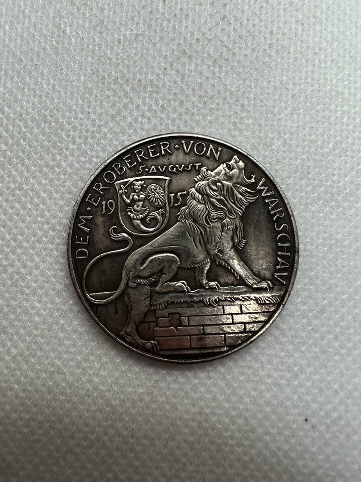 En el reverso, la medalla muestra un leon, emblematico de fuerza y valentía, de pie ante las murallas de Varsovia, que representa la conquista de esta ciudad crucial durante la guerra. La fecha, el 5 de agosto de 1915, marca el día específico del triunfo de las fuerzas alemanas en este conflicto. Sobre el leon, un escudo de armas con una sirena sirve como símbolo historico de Varsovia. El diseño general de la medalla enfatiza no solo la destreza militar, sino tambien el simbolismo de victoria y gloria asociado con este evento monumental en la historia europea. Esta pieza recien acuñada sirve como un recordatorio detallado de un momento importante en el tiempo.