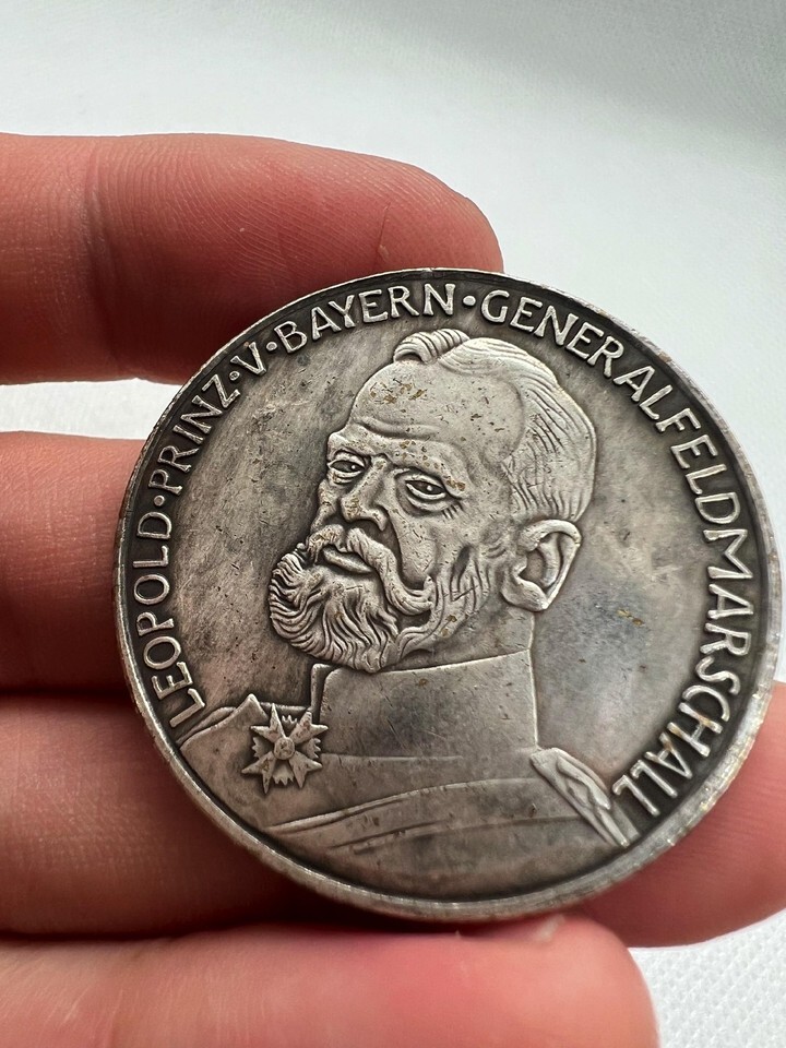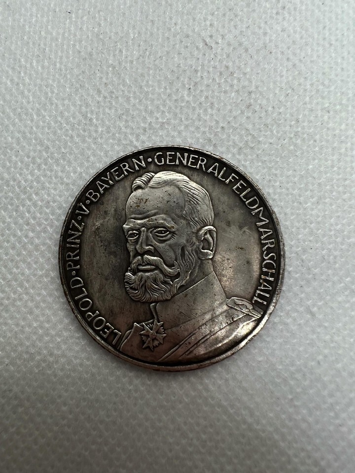 Esta medalla conmemorativa de fantasía honra al general Leopoldo, el príncipe bavaro que desempeño un papel fundamental durante la Primera Guerra Mundial, particularmente en la Batalla de Varsovia en 1915. El anverso de la medalla presenta un retrato detallado del Generalfeldmarschall Leopold, representado en uniforme con expresiones de honor y determinacion. Como una figura prominente de la familia real bavara, Leopoldo es famoso por su carrera militar, llevando a las fuerzas alemanas a la victoria en esta importante batalla. El diseño de la medalla incluye una cruz de merito grabada en su pecho, que simboliza su estimado rango militar.