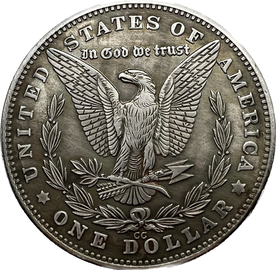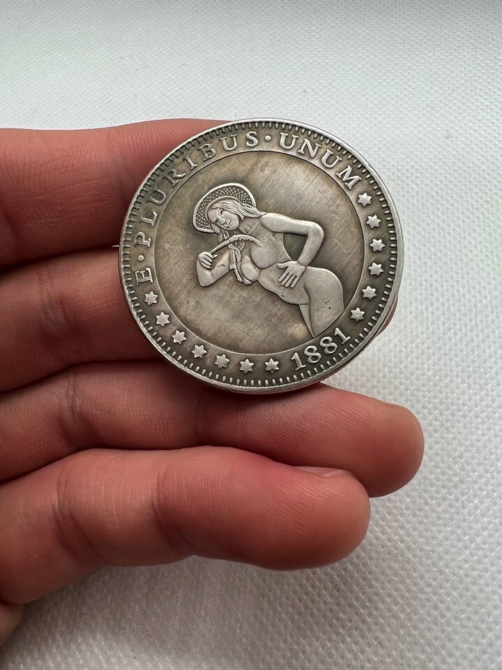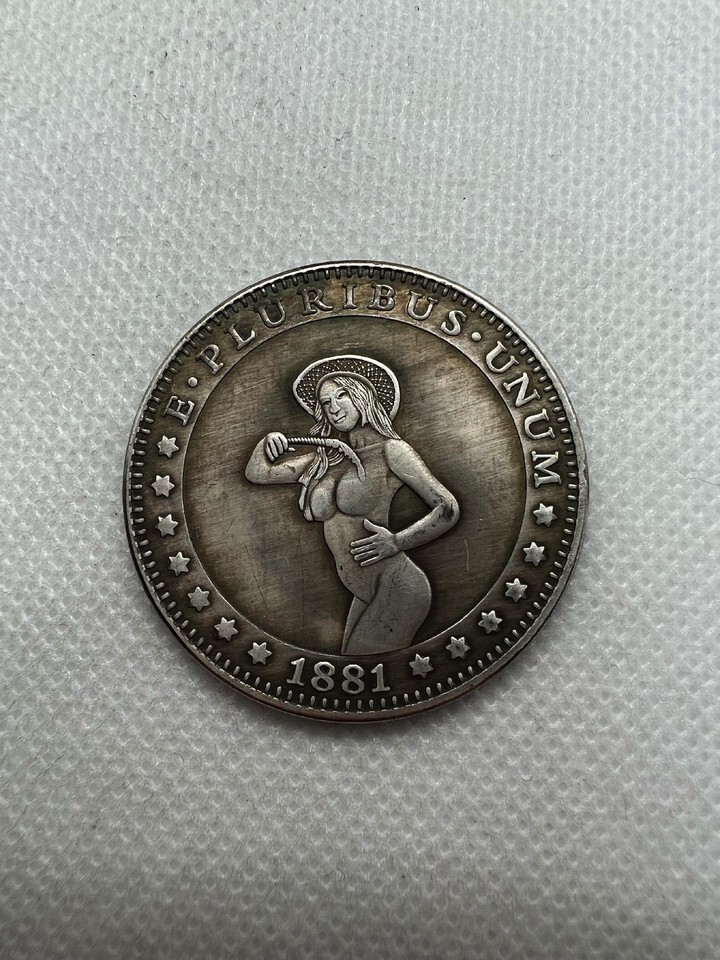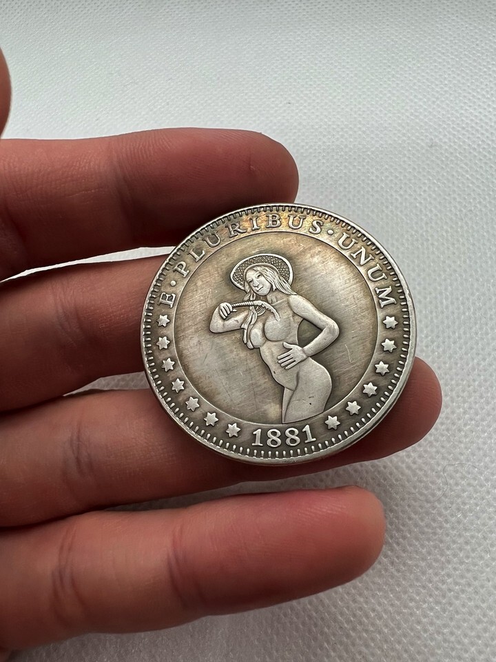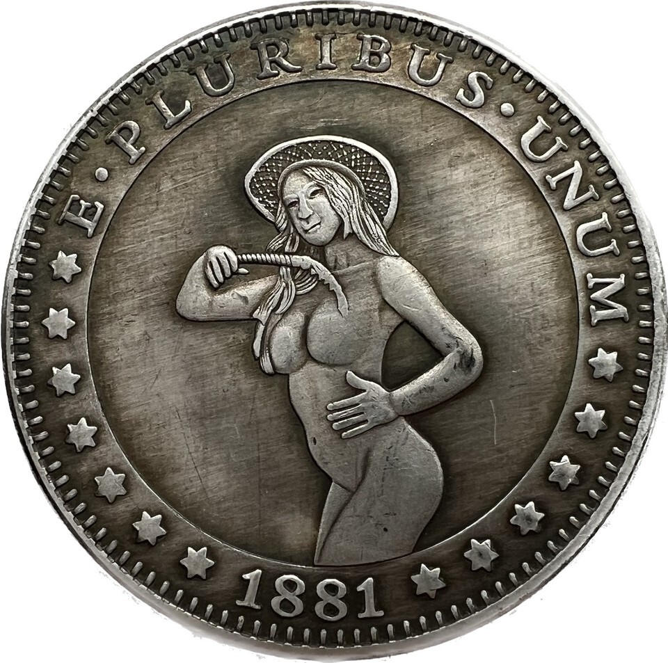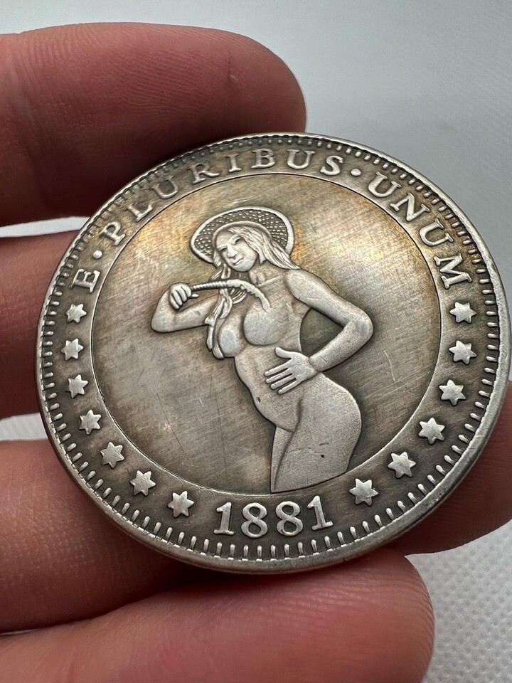 Esta replica de fantasía recien acuñada del dolar americano de 1881 es una pieza coleccionable única con un diseño poco convencional. El anverso muestra una figura femenina distintiva representada en un estilo artístico y provocativo, diferenciandola de las monedas historicas tradicionales. La inscripcion "E PLURIBUS UNUM" y el año 1881 evocan simbolismo ligado a la herencia estadounidense, mientras que la iconografía refleja una interpretacion artística moderna.