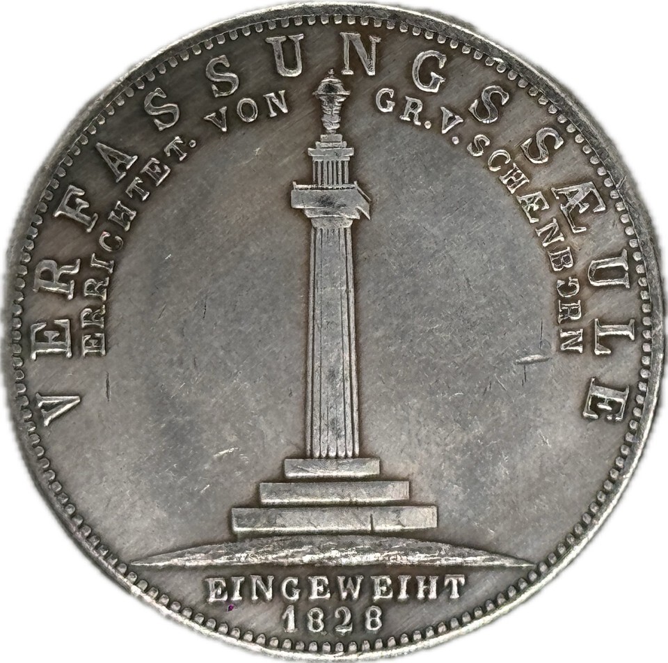 El reverso muestra el monumento Constitutionssaule, adornado con las inscripciones ERICHT VON GR. V. SCHENBORN? y ?EINGEWEIHT 1828?, marcando la dedicacion ceremonial de esta importante estructura. Esta medalla no es simplemente un artículo de coleccionista; significa una era crítica en la historia constitucional bavara. La Constitutionssaule, situada en Gaibach, se erigio como un símbolo del estado constitucional liberal previsto por el rey Luis I y sus partidarios. Esto hace que la medalla no solo sea un importante artefacto historico, sino tambien un notable ejemplo de artesanía artística de principios del siglo XIX. Esta pieza de historia numismatica se distingue por su representacion iconica y el contexto historico de su creacion. Ten en cuenta que esta es una copia.