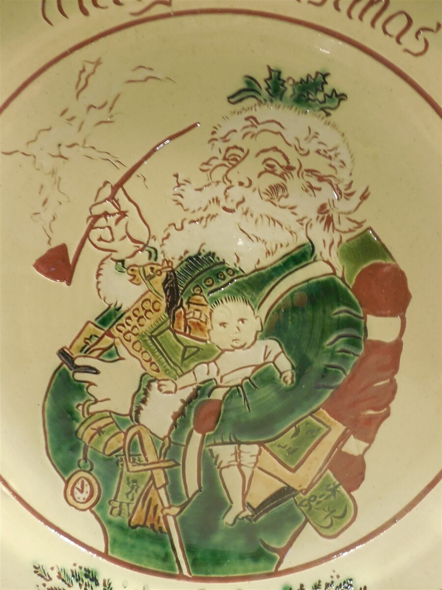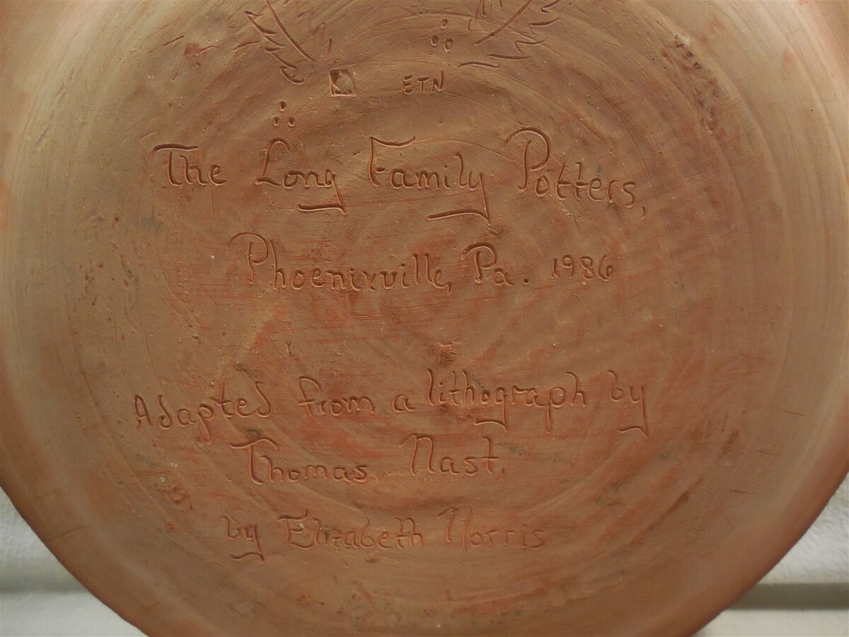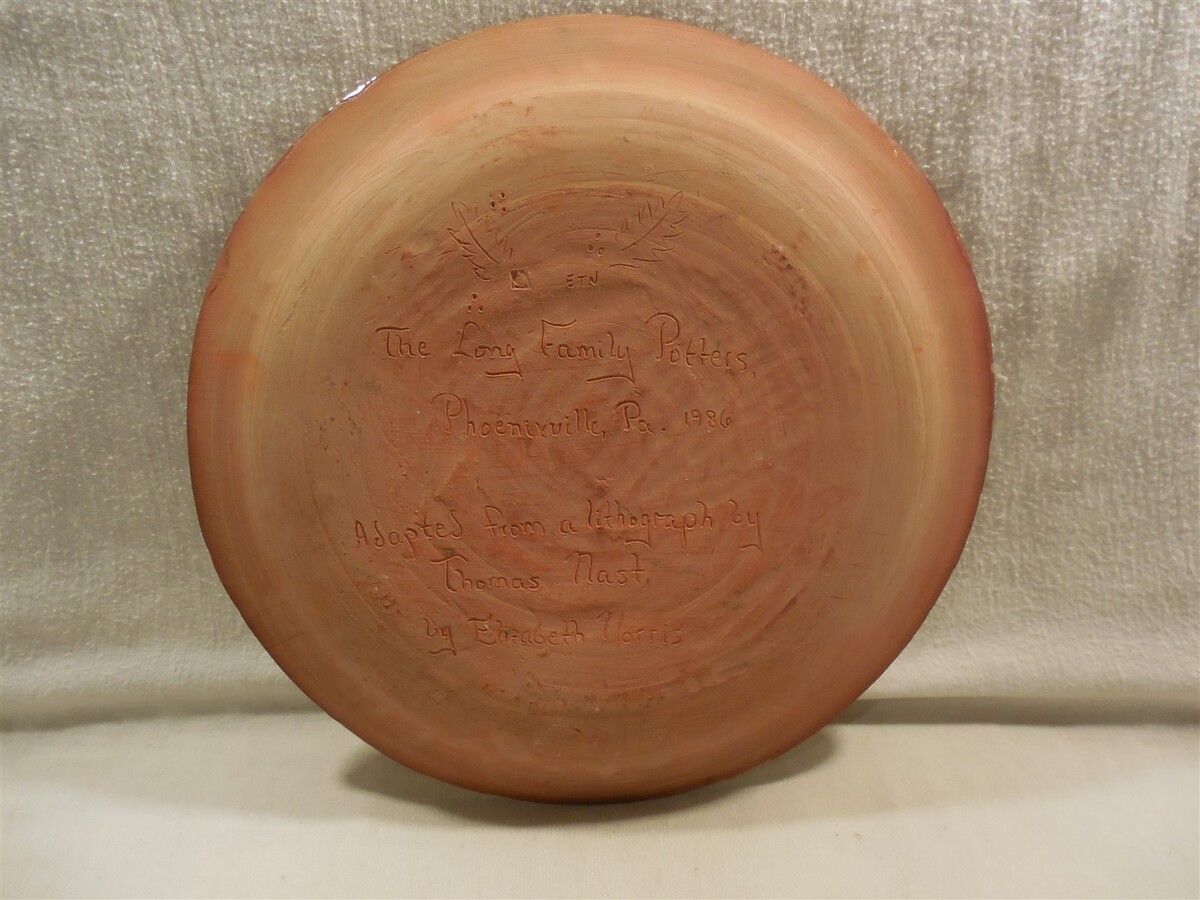 This is a vintage 1986 Long Family Potters (Phoenixville, PA) Redware Christmas Santa Claus Charger plate. The plate is super colorful with a large Santa Claus in the center - Merry Christmas along the top edge - 1986 along the bottom edge. The back of the plate is marked The Long Family Potters Phoenixville, PA 1986 Adapted from a lithograph by Thomas Nast by Elizabeth Norris. The plate measures approximately 1" tall and 12" in diameter. Nice clean cute Long Family Potters redware Christmas Santa Claus charger plate that displays absolutely great when sitting on a shelf or table!