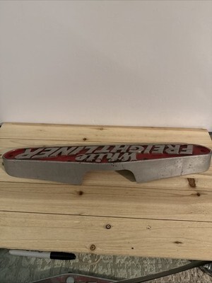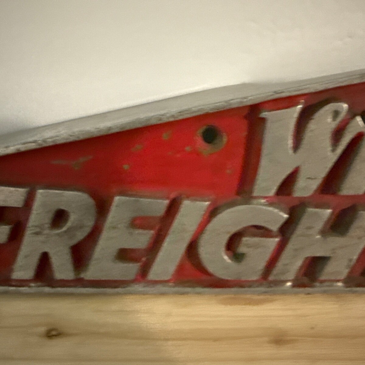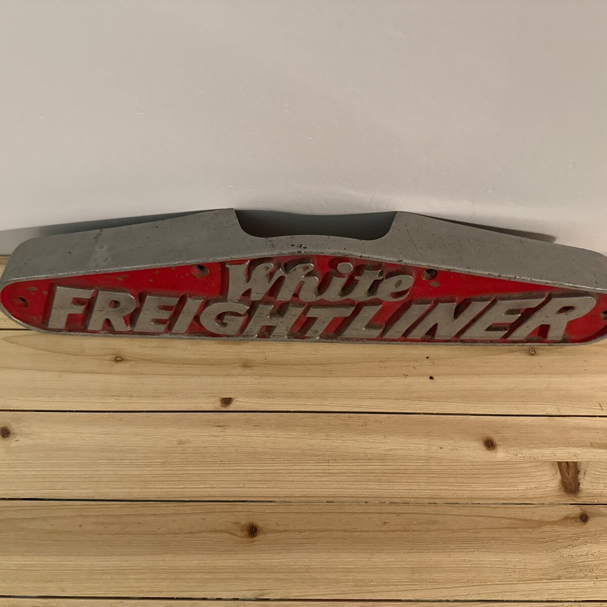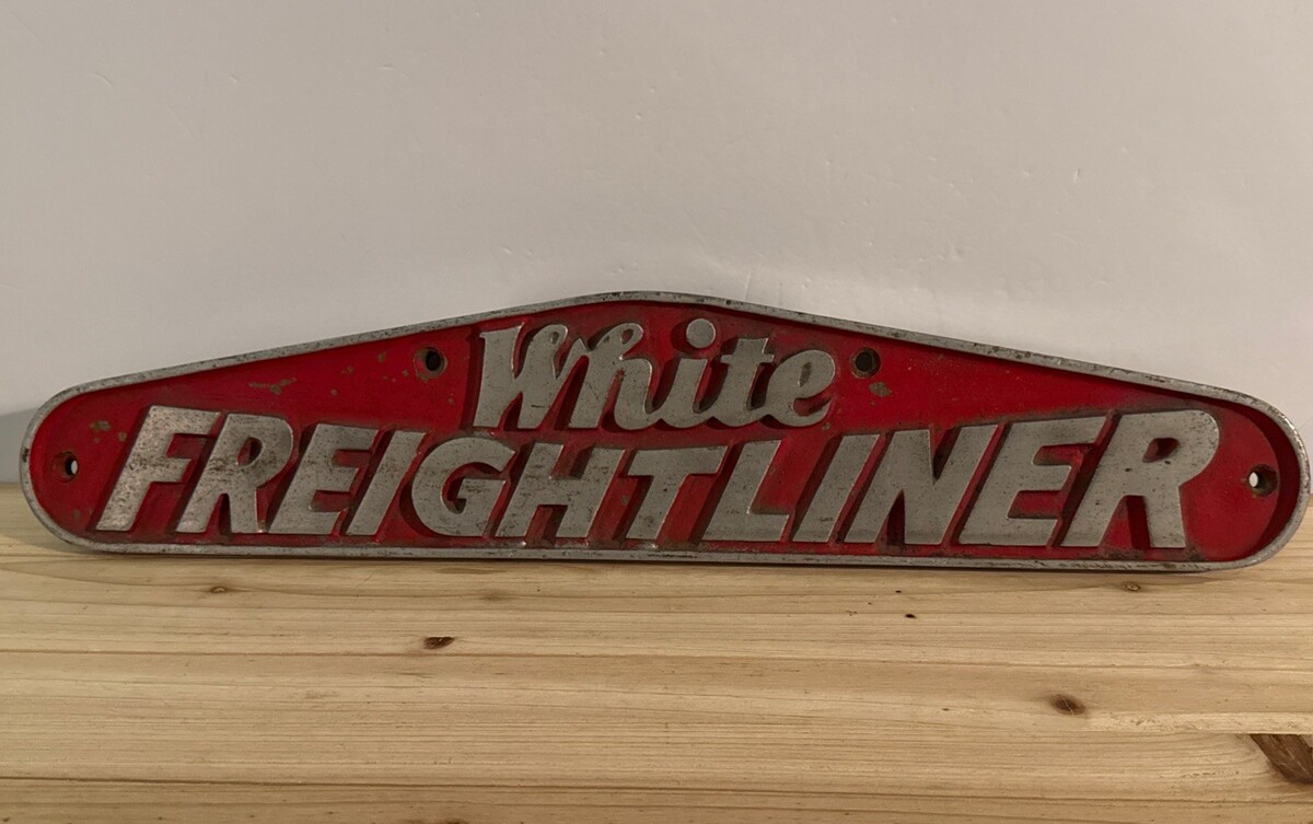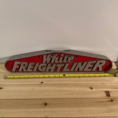 This is the real deal ? factory-original cast metal Freightliner Powerliner emblem from the golden era of big-bore cabovers (approx. 1973?1979). Iconic red background with raised polished chrome/silver letters in that classic bold beveled font. Measures roughly 21?22 inches tall ? perfect for Powerliner, White-Freightliner COE, or high-hood WFT restoration projects.