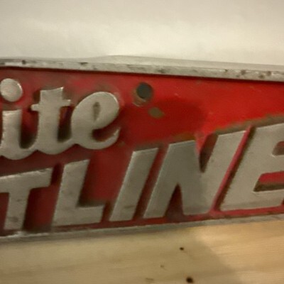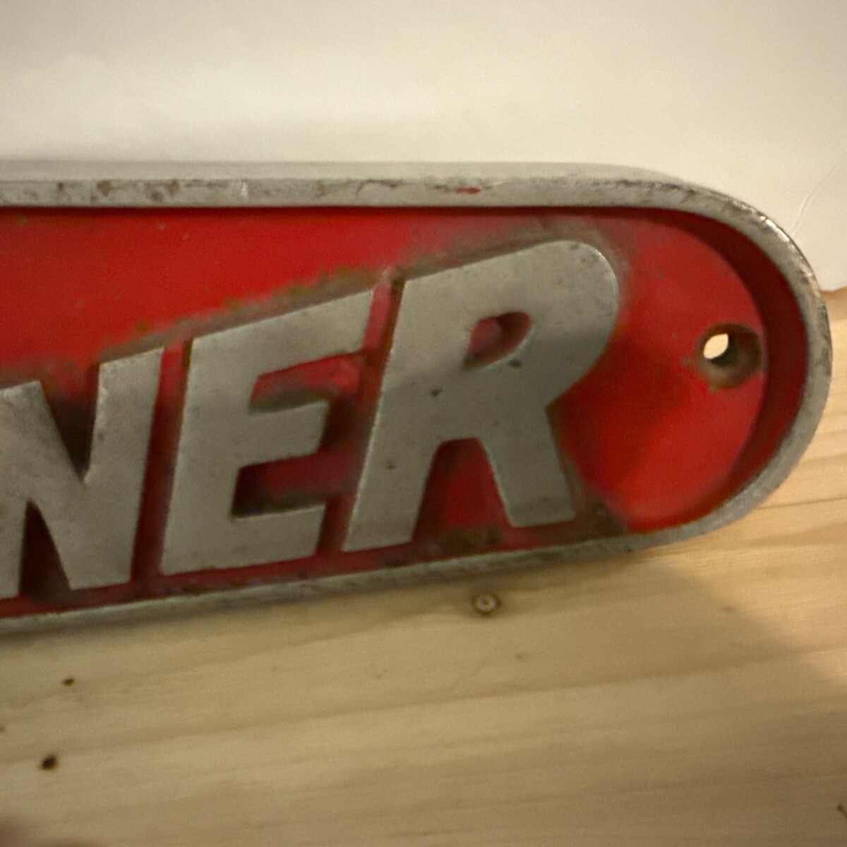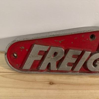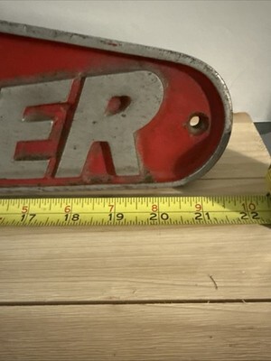 Condition: Good original survivor condition with honest patina (see photos). Red paint is still strong with some light chips and wear from decades on the road ? exactly what collectors want. Letters are bright and proud, no major pitting or damage. All four mounting holes intact ? ready to bolt on or display.